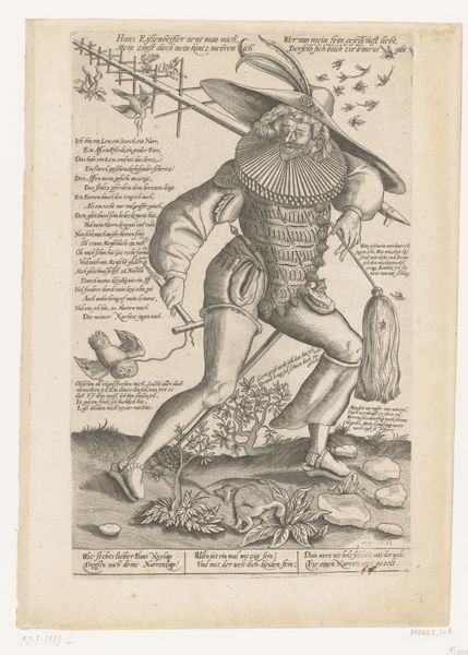 Heinrich Wirich made this print, Lijmstokloper, sometime before 1600, using an engraving technique. Look closely and you’ll see how the artist created this image by carefully cutting lines into a metal plate, which would then be inked and printed. It’s a labor-intensive process requiring incredible skill with tools. The fine lines create a wealth of detail. The figure is festooned with the tools of his trade: the limesticks which give the artwork its name, a broom and knife. He looks like an itinerant tradesman, or perhaps even a figure of mockery: the poem incorporated into the image suggests trickery. We can imagine him as a traveling salesman of the period, dependent on his wits to make a living. The print itself would have been relatively affordable. While the making required technical expertise, it could be reproduced many times over. In its own way, this print is a product of emerging capitalism. It challenges any high-minded ideas about the ‘fine arts.’ This artwork asks us to consider how artistry and craft are always bound to the economic realities of their time.