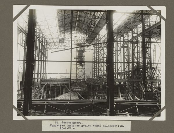 This photograph, "S.O. Goenoengsari. Verdamping. 8 Maart 1927," of unknown authorship, captures an industrial interior with striking geometric precision. The composition, predominantly linear, showcases a complex network of scaffolding, pipes, and architectural supports, all rendered in shades of grey. The interplay of vertical and horizontal lines creates a rigid, almost overwhelming structure that dominates the visual field. This suggests an inherent order but also hints at the potential alienation of industrial spaces. The repetition of forms – the cylindrical tanks, the evenly spaced girders – establishes a visual rhythm, yet it's a rhythm that speaks to the monotonous nature of industrial labor. The figures positioned within this framework appear diminutive, underscoring a sense of human insignificance amidst mechanized grandeur. The photograph destabilizes conventional notions of space, blurring the boundaries between the interior and exterior, the human and the machine. Ultimately, the photograph serves not merely as a document but as a commentary on the structural and philosophical implications of industrialization itself.