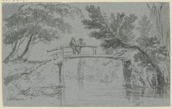 Curator: This is a beautiful drawing entitled "Brug en een knotwilg," which translates to "Bridge and a Pollarded Willow," created by Cornelis de Kruyff. The Rijksmuseum dates it between 1809 and 1854. Editor: It feels so intimate. Like a stolen moment captured in simple lines. There’s a gentle melancholy to it, almost a hush. The delicate use of line to create the ripples in the water are remarkable. Curator: It is indeed a quiet piece, characteristic of the landscape art popular in the Netherlands at that time. What stands out to me is how De Kruyff positions the bridge not just as a functional object, but as a feature deeply entwined with nature. Consider how the bridge seems to rise organically from the riverbank, connected intimately to the weeping willow. Editor: Yes, it feels almost subversive. Here we have an ostensibly utilitarian subject, yet its romantic framing invites considerations regarding humans’ fragile attempts to coexist with nature—and I say "attempts" consciously. This depiction feels idealized and inherently unsustainable. Curator: That’s an interesting point. Given its probable creation date in the early 19th century, we are seeing a Romantic interpretation, filtering observed reality through an aesthetic lens informed by ideas of the sublime. De Kruyff, and indeed, the Dutch art world at the time, would have likely embraced imagery conveying a sense of national identity and pride connected with rural landscapes. Editor: Right, it speaks to the construction of national narratives that elide the complexities of the time, especially regarding issues of class and labor related to managing this "nature". Who benefits from that bridge? Whose labor maintains it and the landscape around it? Curator: A valid concern. This landscape does function within broader socio-political narratives. But I also think De Kruyff sought to portray the enduring qualities of the Dutch landscape, reflecting perhaps on more timeless themes, a theme to offer solace during periods of political upheaval. Editor: Perhaps, though I remain skeptical about appeals to "timelessness" in art, given how constructed these ideas tend to be. For me, the artwork’s quiet beauty opens a dialogue between idyllic representation and a much more nuanced reality. Curator: A dialogue which, hopefully, continues for our visitors too. Editor: Agreed, let’s hope it sparks conversation and critical reflection.