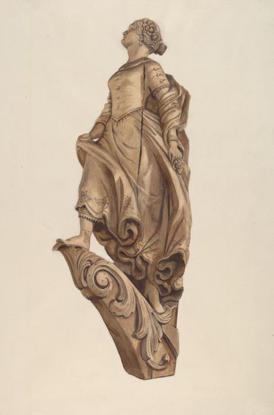 Curator: Well, here's a rather curious piece: a drawing of a wood carving from around 1939. It’s titled “Profile Face” and attributed to Gerard Barnett. Editor: Intriguing. Immediately, I see a juxtaposition of the regal and the rough-hewn. The lion's head evokes heraldry, power, tradition – but the wood itself, the medium, looks like a simple, unvarnished material. It's got an honest quality to it. Curator: Exactly! It reminds me of those old, gothic bestiaries, you know? Imagine finding it in a forgotten corner of a castle, a whimsical guardian watching over dusty secrets. It’s got this peculiar charm. Editor: I’m more interested in how something like this sits between design and craft. This was 1939, on the eve of war. Was this design meant for mass production? Was there a plan for a fleet of fierce wooden beasts? The raw quality also suggests that skilled labor here might be overlooked. What’s valued here: the vision, or the hand? Curator: A provocative question, and certainly food for thought in those pre-war years. Yet, looking at the sensitive lines in this drawing, it feels so alive – almost yearning. I wonder, if the piece could speak, what stories it would tell? Editor: If wood could talk… probably about the axes and chisels involved in shaping it! Consider the forests, the felling of trees, the process of seasoning. This lion carries all those histories, all those human efforts. And this drawing also memorializes Barnett's unique efforts as well, freezing it. Curator: Indeed. It speaks to how materials – and making – become silent witnesses to both grand narratives and deeply personal stories. So, next time you pass an antique carving, think not just of its face, but also its many untold tales. Editor: Well said. I’m left thinking about value. Whose hands, whose vision, do we elevate, and what truly constitutes “art” versus "design"? Food for thought, indeed.