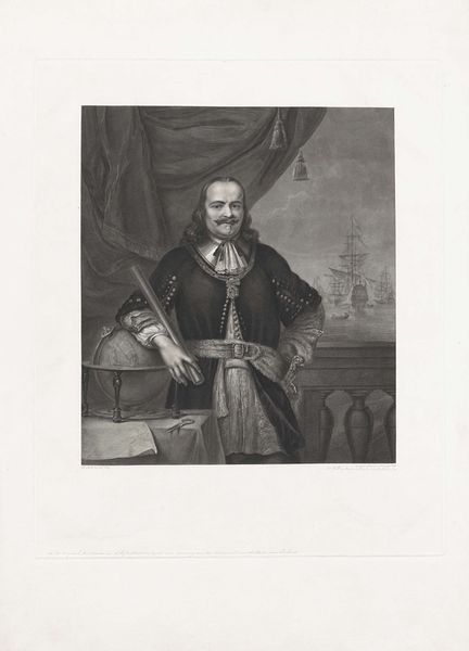 Franciscus Bernardus Waanders created this portrait of Michiel Adriaansz. de Ruyter using lithography. The composition is formally structured around the sitter who is framed by elements that speak to his status and occupation. Note the strong verticality achieved by the figure of De Ruyter, contrasted by horizontal lines of the table and text, which creates a sense of balance. The use of monochrome lithography, with its subtle tonal gradations, imbues the scene with a sense of seriousness, inviting contemplation on the sitter's legacy. The portrait uses several semiotic cues: the globe signifies exploration and dominion, while the naval scene in the background alludes to maritime power. Through this calculated arrangement and symbolism, the artist constructs a narrative of authority and achievement. Ultimately, this work is an exercise in constructing a public image through careful manipulation of form and symbol. It invites us to consider how portraits function not just as representations, but as carefully constructed statements about identity and power.