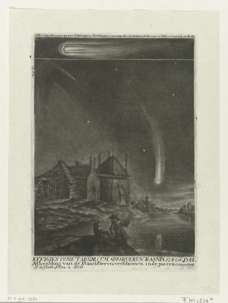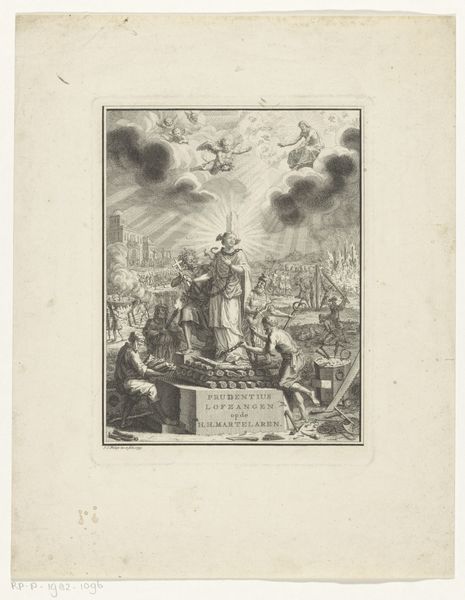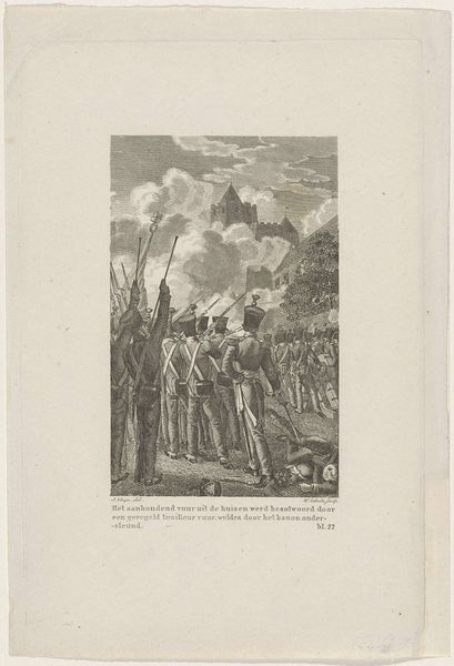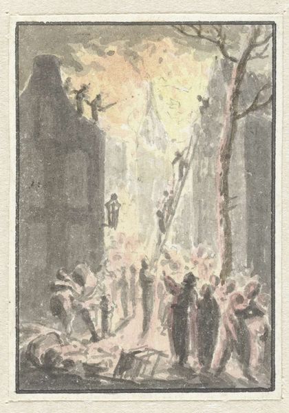 Editor: This is "Ontploffing van het kruitmagazijn te Maastricht, 1761," or "Explosion of the Gunpowder Magazine in Maastricht, 1761," by Reinier Vinkeles, created sometime between 1783 and 1795. It’s a drawing, an engraving on paper. What strikes me first is the dramatic composition—the way the artist has depicted this sudden explosion, its stark contrast to the landscape and people. How do you interpret the elements within the work? Curator: Formally, one notes the composition's division. We have a foreground occupied by figures and a suggestion of architectural presence. The mid-ground transitions towards the implied cataclysm in the background. Notice how Vinkeles structures the space, using linear perspective, though subtly, to draw the eye towards the event. The lines of the explosion create a strong focal point. How does the texture influence your perception? Editor: I see how the fine lines of the engraving add to the intensity of the explosion, but almost give it an antique, story-like quality. The trees seem almost skeletal in contrast, mirroring a feeling of vulnerability. Curator: Indeed. The strategic deployment of line and the contrasting values articulate a dynamic tension between destruction and the static elements. Do you think the positioning of the figures in the foreground helps enhance this feeling of impending change? Editor: Absolutely, their frantic energy amplifies the drama unfolding behind them. What did you mean by 'value'? Curator: A painterly term. In the context of monochrome printmaking, the ‘value’ references the scale between pure black and white and all the greytones in-between. Note the tonal differences near the focal area. Overall, this contributes to a captivating, although unsettling, visual experience, a testament to Vinkeles' skill. Editor: I learned so much! Considering your analysis, the formal elements create this intense feeling for the viewer, far beyond a mere historical record. Curator: Precisely, paying close attention to its components reveals deeper artistic choices at work.