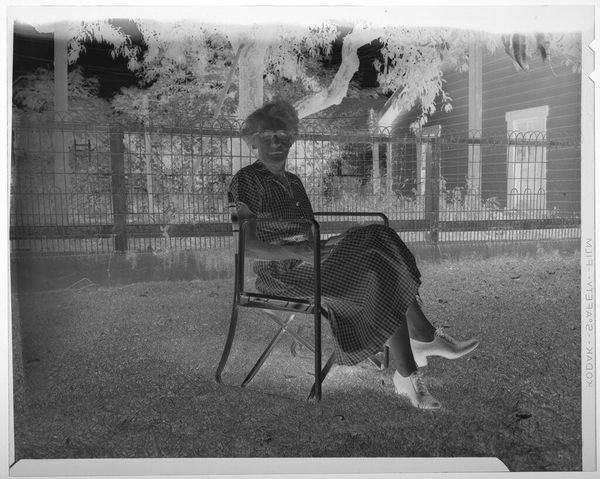 Curator: Mrs. Gunn sits enshrined in the geometric structure of her porch, in this work by Ansel Adams. It is a gelatin silver print, titled "Mrs. Gunn on Porch, Independence, California", likely created sometime between 1944 and 1981. Editor: What strikes me immediately is the feeling of stillness. It's a portrait imbued with a profound sense of quiet observation. There's almost a spectral quality to the scene, a melancholic hush. Curator: Note the contrast in textures. The smoothness of the clapboard siding is set against the coarse foliage beyond the porch. And look how Adams employs the striped awning to further accentuate this contrast through the play of light and shadow. Editor: Those chairs, though. Don’t they evoke a bittersweet image of a shared life, perhaps of children grown and gone? The presence of that daybed heightens that sense of solitude. What stories could this veranda tell? Curator: Precisely. This work epitomizes Realism in how it documents a single moment in time, while layering various lines to create focal tension between Mrs. Gunn and her environs. The overall effect, a study in contrasts, is harmoniously aligned to Adams' sharp vision. Editor: The portrait becomes a vessel filled with cultural memories. Even the simple act of looking out from a porch carries weighty connotations. This work is heavy with implication – the woman, her pose, even the setting… they all weave together to summon sentiments far beyond what's immediately visible. Curator: An incisive observation! To synthesize: Mrs. Gunn’s stillness isn't mere portraiture, but is the stable nexus around which every visual relationship pivots within the structured space of the porch. Editor: Yes, and in that stability, we discover so many nuanced readings on memory, loss, the everyday. Curator: Agreed, an elegant synthesis of the representational and the emotional.