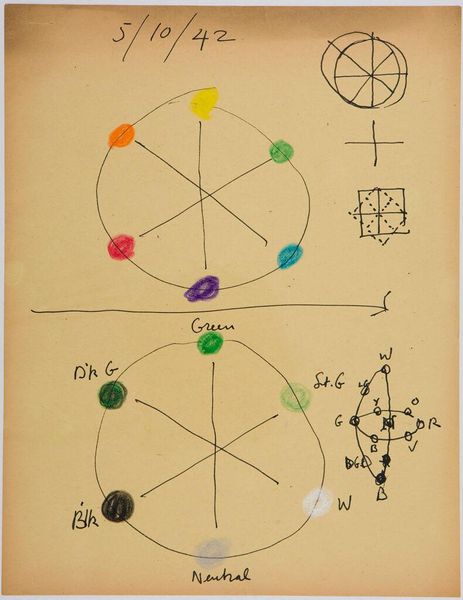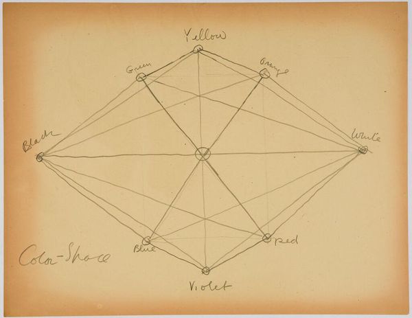 Curator: Here we have Stuart Davis' "Color-Space Diagrams," a drawing whose date is unspecified, housed here at the Harvard Art Museums. It measures about 21 by 27 centimeters. Editor: It looks like a visual representation of synesthesia, where colors and spatial relationships blur. Quite a conceptual blueprint. Curator: Davis explored how color could be systematically structured, mirroring his broader interest in architectural forms and urban environments. The materials – paper and pencil – suggest the immediacy of this exploration. Editor: I see a mind at work, grappling with the unseen connections, a sort of color algebra expressing the elusive harmony of the city in a purely abstract dance. Curator: Indeed, Davis was interested in how mass production and commercial design could be used to make art more accessible and relevant. Editor: What starts as a diagram evolves into a deeper meditation on how we perceive and structure reality. Curator: Precisely. It really encourages us to consider the origins and evolution of artistic intention. Editor: It sure does. It feels like a riddle I'll be pondering long after I've left the gallery.