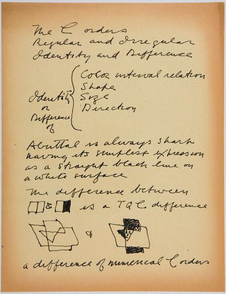 Curator: This piece, "Art Theory Text with Types A and B Configuration Diagrams," is a fascinating look into Stuart Davis's creative process. Editor: It's like peeking into his mind! I find the handwritten text and diagrams so immediate, so raw. Curator: Exactly. It reveals Davis's exploration of spatial relationships and color theory, which greatly influenced his work. Notice the meticulous way he outlines his principles for using shape and color, almost like blueprints. Editor: Those A and B configurations are so simple, yet he teases out such complex dynamics from them. And the material of the paper itself, its texture, adds to the sense of intimacy and direct connection with the artist's hand. Curator: Right, it blurs the lines between high art and the labor involved in artistic creation. We see the materiality of his thinking. Editor: Seeing the foundation of his theories makes me appreciate his finished work on a deeper level. Curator: Agreed. It gives us a unique understanding of Davis’s methodology.