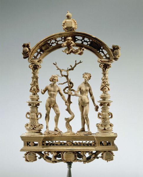 Editor: Here we have a console table designed by Herter Brothers, crafted between 1879 and 1882, which comes from the drawing room of the William H. Vanderbilt House. It incorporates marble, wood, gold, and mixed media, creating a rather opulent effect. What strikes me is how imposing the figures of the griffins make the piece; almost architectural. What do you make of it? Curator: Indeed, it's the layering of symbols which command attention. Notice how the griffins act as both support and symbolic guardians, creatures drawn from ancient mythologies. This melding of support and symbolism reinforces cultural memory and implies power and prestige. Why do you think they chose the griffin rather than another symbol, say, an eagle? Editor: Well, maybe because the griffin is more exotic, with that combination of lion and eagle… less overtly American. Curator: Precisely. The late 19th century witnessed America's Gilded Age, where wealthy families like the Vanderbilts sought to legitimize their status. Griffins, linking back to classical antiquity and heraldry, signaled cultivated taste and established lineage – even if newly acquired. What emotional associations do these mythic references bring to your mind? Editor: I think they evoke a sense of timelessness. The use of gold and marble adds to that feeling of enduring value, beyond mere financial worth. Curator: Exactly! Gold, universally associated with wealth and divinity, further elevates the console. And consider the mother-of-pearl inlays – subtle flashes of iridescence which contrast with the solidity of the carved wood and marble. In this light, would you still see it merely as furniture? Editor: No, I see how each carefully chosen symbol and material builds a narrative, less about function and more about projecting an image. Curator: And the stories these objects whisper shape our understanding of cultural aspirations, social identities, and historical contexts. This console serves as more than just a place to set a vase; it represents a potent symbol of a family's ascent. Editor: It's incredible how much history and cultural context can be embedded in a single object! I'll definitely look at decorative arts differently from now on.