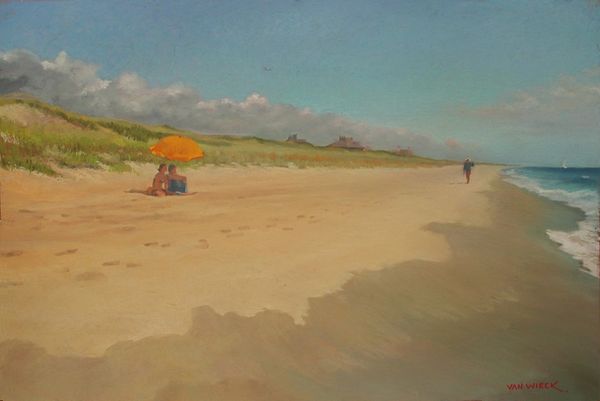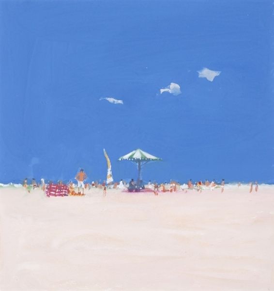 Editor: Here we have Mark Beck's "Summer of All Summers", an oil painting depicting a beach scene. The composition is dominated by a lifeguard tower, and there's this feeling of quiet solitude. What strikes you most about this work? Curator: What interests me immediately is how this painting speaks to our anxieties around safety and surveillance. Think about the very role of a lifeguard: to observe, to protect, but also, implicitly, to control. Where does that line between assistance and authority blur in this seemingly idyllic setting? Editor: I hadn't considered the idea of control. I was more focused on the solitary figure and the vastness of the ocean. Curator: Exactly. Consider the cultural weight of beaches, spaces often presented as free and liberating, but are often surveilled and subject to various regulations, particularly impacting marginalized communities. The racial politics of access to public spaces come to mind. Does this solitary figure feel truly free, or are they contained, in their own way, within the structures represented by the tower? Editor: So you're saying the painting might be hinting at the ways societal structures can impose on individual experience, even in a place associated with leisure? Curator: Precisely. It prompts us to question whose "summer" this really is and for whom this scene of relaxation is actually intended. Also, who has historically and continues to be denied such leisure due to social injustice? The artist presents a very picturesque scene, but could this painting simultaneously be questioning our own complicity of acceptance of a potentially exclusionary landscape? Editor: That's a powerful interpretation. I'll definitely look at it differently now. Curator: I am glad to broaden our discussion with intersectionality and a critical analysis.