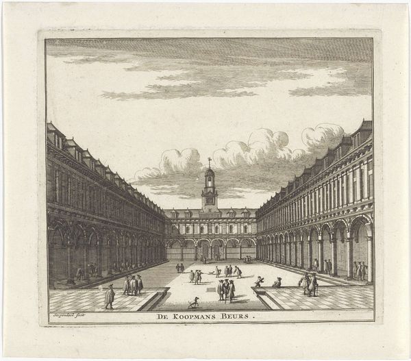Jan Lamsvelt created this print of the Cour de la Fontaine at Fontainebleau. The composition orchestrates architectural elements, garden features, and human figures into a coherent visual narrative. Lamsvelt uses the Cour's architecture to divide the pictorial space into distinct zones. The foreground is marked by a balustrade and arched substructure, setting the stage for the garden. Then, the fountain serves as a focal point, drawing the eye towards the palace, which acts as the backdrop. This arrangement is not merely representational; it is a careful manipulation of perspective. The figures in the garden are strategically placed to guide the viewer’s gaze, creating a sense of depth. The linear quality of the garden paths and the sharp lines of the architecture contrast with the organic forms of the trees and the fountain's water, creating a visual tension. The print offers a glimpse into the cultural values of the time. The formality of the garden and the structured composition reflect a desire for order. We see the aesthetic and philosophical concerns through the lens of visual order.
