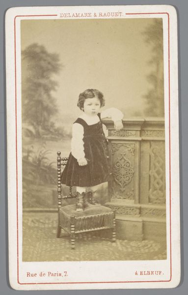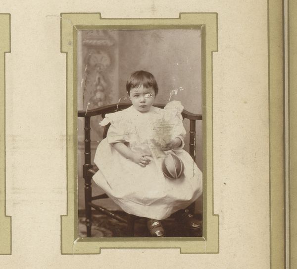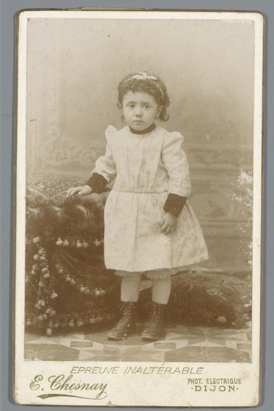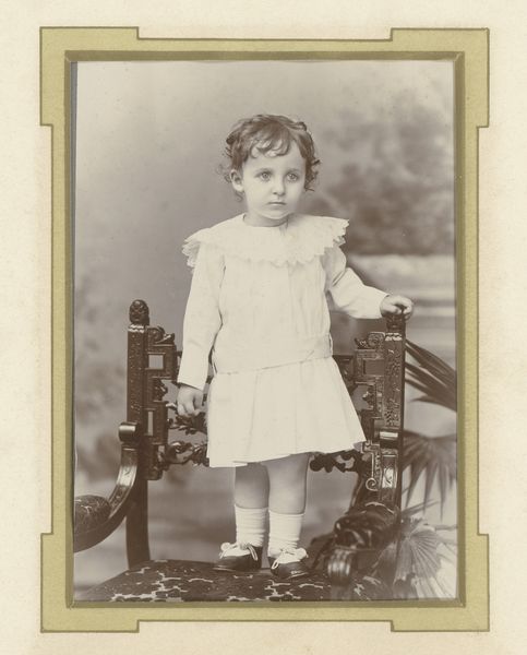 Curator: Let's spend some time with this intriguing portrait, likely titled "Portret van een meisje, vermoedelijk Jeanne," dating from around 1880 to 1910. It is captured through the medium of photography. Editor: Immediately, I’m drawn to the soft, almost dreamlike quality. There's a stillness, an innocence captured in this moment that’s both captivating and a little melancholic. I'm interested in the labor behind the image making in this moment. Curator: The girl, presumably Jeanne, occupies a visual space thick with Pictorialist aesthetics, evoking the sentimental nature of the era’s visual language, speaking of cultural memory through symbols of innocence and upper class leisure. Her carefully chosen outfit, the slightly softened focus - these all contribute to an aura of carefully constructed beauty. Editor: Precisely. Note the studio setting too – that heavily ornamented chair she is sitting on. The quality and texture is not particularly rendered; this all gives a sense that material surroundings were very important, but the process was valued most in this moment. The studio photography speaks to an era of growing consumerism. Photography itself as an emerging industry... Curator: You're right, there’s a tangible tension between capturing a likeness and crafting an idealised representation, reflecting social conventions and parental aspirations. Even that perfectly placed ribbon and prim dress, what is the symbol hidden within them, I wonder? Is the artist interested in a memory, or is this alluding to something more deeply symbolic? Editor: Definitely idealised, the question being at what cost? Did these processes exploit young female laborers behind the camera, as sitters in front of the camera? Photography was both liberating and potentially exploiting individuals like Jeanne. Who did all that stitching? What does it represent materially to have these textures carefully laid out? It seems there is as much meaning embedded here for what we cannot access. Curator: That shadow speaks to the cost indeed; what it takes to represent cultural identity! Editor: And where the economics lay there lies our culture. Curator: A fascinating glimpse, indeed. Editor: Exactly. I keep circling back to the fact of labor and capital embodied within the girl.