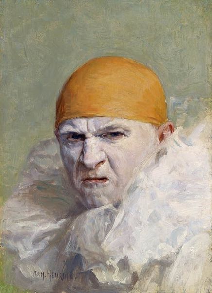 Curator: Here we have a painting titled "Self-portrait" by Armand Henrion. The medium appears to be oil paint, and you can see a notable impasto effect adding texture. What's your initial take on it? Editor: It’s… unsettling. The white face and exaggerated smile—it gives the impression of forced performance, perhaps a critique of societal expectations to appear happy. Curator: Interesting. Structurally, observe the artist's approach to light. The subtle shading around the eyes and the nose brings a remarkable depth, mitigating the flat, potentially cartoonish effect of the white face. Editor: Indeed. And considering that, broadly, the clown has historically represented marginalized or satirized figures, this image feels imbued with complex, perhaps conflicting commentary. Is the artist implicating himself in these power dynamics? Curator: Potentially. Looking at it from a formalist lens, though, the contrast between the muted background and the stark white of the makeup also does some pretty heavy lifting in drawing your attention to the details of the face. Note especially how Henrion contrasts that surface plane against the round hat on the head. Editor: I agree that the texture adds nuance. But I see the painting within the context of the artist positioning themselves, deliberately, within this historicized and loaded archetype, even as he invites our gaze. Curator: Do you think the slight asymmetry in the subject’s expression furthers that idea of performative identity, an idea you discussed? Editor: Absolutely. It reinforces that this "happy" visage isn’t a natural one, but a construct. Think about the times we are called upon to put on a face—now translate that on to this portrait’s face. Curator: I suppose there’s no easy reading. But I’m struck by how the artist plays with shadow and light, creating almost an otherworldly aura. Editor: Ultimately, it’s a very thought-provoking image that leaves us grappling with the multiple meanings that the artist evokes in this singular depiction of the self.