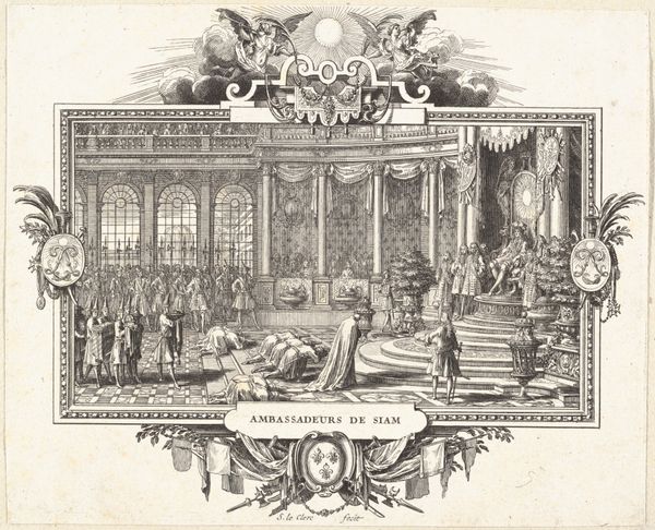 Editor: This print, "Hollandse leeuw en Republiek der Zeven Verenigde Nederlanden," created in 1654 by an anonymous artist, is quite striking. The lion with a crown is rather impressive. I'm intrigued by the division of space and all the heraldic details; how would you interpret this composition? Curator: Aesthetically, the division into distinct registers is paramount. The upper section, dominated by the crowned lion and allegorical figures, exists in tension with the lower register which depicts, as you noted, an assembly within a formal interior. The artist uses line and form to delineate these spaces, constructing meaning through this very juxtaposition. Note the open book at the lion’s feet. What is its relevance in anchoring this allegorical beast? Editor: The open book seems to be symbolic but hard to discern why; maybe it signifies knowledge or law upon which the lion stands? Curator: Indeed. The book, along with the hat atop the staff the lion grips, constitutes a symbolic architecture. What function do these formal, constructed visual relationships fulfill? Semiotics decodes the layers. This meticulous arrangement points towards ideas of justice, power, and the very foundations of governance. Do you see a interplay between these conceptual elements and the Baroque stylistic approach? Editor: I can see that now, especially with the emphasis on detail and dramatic contrast. But why the sharp division between the lion and the assembly? Is it only visual, or does it suggest a hierarchical relationship? Curator: Ah, that's the question isn't it? What statement about civic life does the engraver wish to communicate by placing abstract authority squarely above practical assembly? Editor: I now see how a close reading of these formal elements yields meaning and directs my appreciation of the work. Thanks! Curator: Indeed, this deeper investigation enriches the whole experience. The structure dictates so much about the overall understanding.