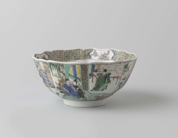 Curator: Here we have a slop bowl, made of porcelain between 1730 and 1740. Its creation reflects a time of ornate detail in functional ware. Editor: The grisaille decoration and stark contrast of the monochrome palette are arresting! It has a distinct feel—formal, perhaps, and yet the bowl itself suggests domesticity. Curator: Indeed, the decorative style references detailed landscapes and hints at genre paintings. Note the precise rendering; the craftsmanship speaks to a deep understanding of material properties. How the glaze interacts with the light! Editor: This level of detail on what is, after all, an everyday object, does raise questions about access. Who had the leisure, the privilege, to invest in something like this? Was the landscape depicted idealized to conceal the social realities of the time? Curator: Consider also how the shape of the bowl itself acts as a framing device. The curve dictates the viewer's experience, segmenting the landscape. And observe how negative space—the untouched porcelain—creates depth. Editor: Looking closer, it strikes me how serene the landscape appears—almost detached from the human element. Was it intended to evoke nostalgia or a kind of utopia, sharply contrasting with the social inequities of the period? I wonder about the specific narrative implied here. Is it a statement of power? Or is it merely an aspiration to a life free from the burden of manual labour? Curator: To disregard such aesthetic choices, and to reduce it all to merely politics seems almost reductive. Editor: But shouldn’t art history push us to see beyond pure formalism and challenge us to re-examine narratives? Curator: Perhaps in the meeting of forms and interpretation lies a greater appreciation for our place in an art history shaped as much by economics as innovation. Editor: Absolutely. Seeing the landscape as a representation of a social order—not merely as an aesthetic choice—provides context, not constraint. It challenges our notions of art as a purely visual experience.