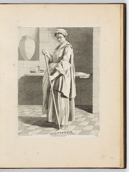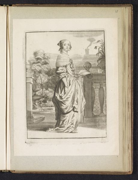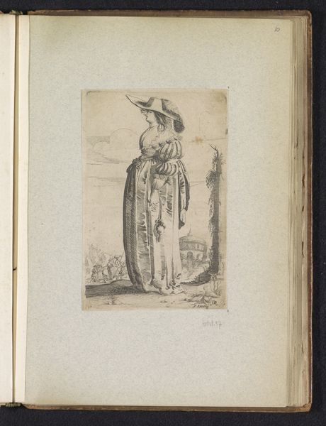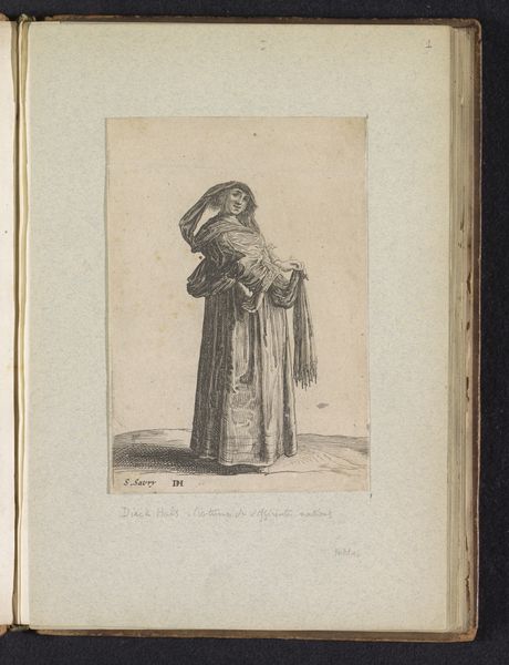 Editor: We're looking at "Vrouw, gekleed volgens de mode omstreeks 1620, met veren stokwaaier," or, "Woman Dressed in the Fashion of around 1620, with a Feather Stick Fan," created around 1620 by Salomon Savery. It's an ink drawing on paper housed at the Rijksmuseum. I'm immediately struck by how... stiff she appears, almost like a paper doll. What's your take? Curator: Stiff, yes, perhaps because we’re encountering her through the lens of precise, deliberate lines, like tiny scratches holding her form. Imagine Savery, pen in hand, meticulously mapping out the topography of early 17th-century fashion. I see the confidence – almost audaciousness – of Baroque fashion, distilled into these precise strokes. Her attire speaks volumes – the exaggerated sleeves, the tall, broad collar. What story do you think those details tell? Editor: They hint at wealth and status, definitely. It's almost comical how wide her collar is! It reminds me of those Elizabethan ruffs, just…flattened. Curator: Precisely! It's visual bravado. Think of these drawings as records, too. People were incredibly invested in what they wore - fashion became increasingly a tool of social performance, even in portraiture. What do you suppose is suggested by that feathered fan? Is she trying to conceal herself or draw more attention? Editor: I think it's both, maybe. Like, "Look at me, but don't look *too* closely." It's playful but controlled. I hadn’t considered the performance aspect so deeply. Curator: It’s the enduring magic trick of portraiture. Every mark, every stroke, is a gesture of visibility and a carefully constructed veil. Ultimately, a dance between artist, subject, and the discerning eye of the viewer. Editor: So well put. Thanks, this gave me a new view of the work and fashion history, not to mention drawing techniques.