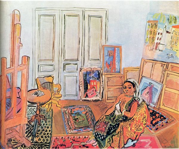 Editor: This is Henri Matisse’s "Le Tabac Royal," created in 1943 using oil paint. There is something so intimate about this piece - you can almost smell the tobacco. How do you read the still life in terms of material culture? Curator: I'm struck by the seemingly careless inclusion of “Le Tabac Royal” – is Matisse commenting on commodity fetishism through such overt display, even in wartime? Note the layering of the production: raw material becomes processed good, then high art. Editor: I see what you mean. So, the painting isn't just a portrait but a study of the materials that construct everyday life? What about the labor involved in the weaving and the chair making? Is he pointing to social structures embedded in materials? Curator: Precisely! Consider the juxtaposition: a faceless model and her ornate chair become objects themselves. It really does blur the boundaries between human and material production. But is the seeming detachment or even critique, complicit with that production through consumption of luxury goods like the chair and “Le Tabac Royal”? Editor: Interesting. He doesn’t quite resolve that tension, does he? He throws all these raw and treated elements together and the viewers have to make their own choice. Curator: Exactly. We're left to question our relationship with production, labor and objects during conflict and beyond. Art here, prompts uncomfortable material realities. Editor: It’s more than just Fauvism and modernism, really! Thanks for pulling out how Matisse made the social process the subject itself. Curator: It makes you appreciate the loadedness of a ‘simple’ painting like this, doesn't it? It makes me wonder what other everyday encounters should provoke these deeper questions.