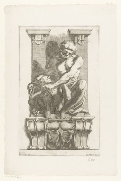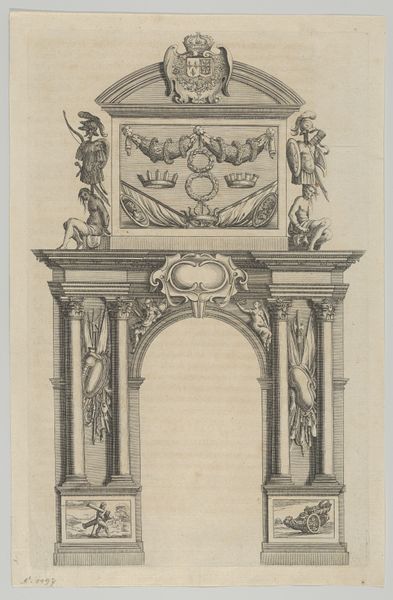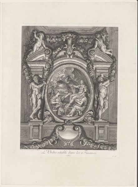 This is the upper left portion of François Spierre's "Allegorie op Cosimo III de' Medici in monumentale omlijsting", an engraving executed around the 17th century. The print showcases an elaborate frame design, richly decorated with baroque motifs. The eye is immediately drawn to the intricate detailing of scrolling patterns and symbolic figures, carved into a monumental structure. In semiotic terms, the frame acts as a signifier of power and prestige, literally setting the boundaries for the idealized image of Cosimo III. But Spierre's work engages with ideas of representation. The linear precision and structured composition speak to a desire for order, yet the exuberant ornamentation destabilizes any sense of classical restraint. Notice how Spierre uses hatching to model form and create depth. The contrast between light and shadow not only adds a dramatic quality but also reinforces the ideological weight of the imagery. This is more than mere decoration, but rather a visual construction designed to legitimize and immortalize its subject.