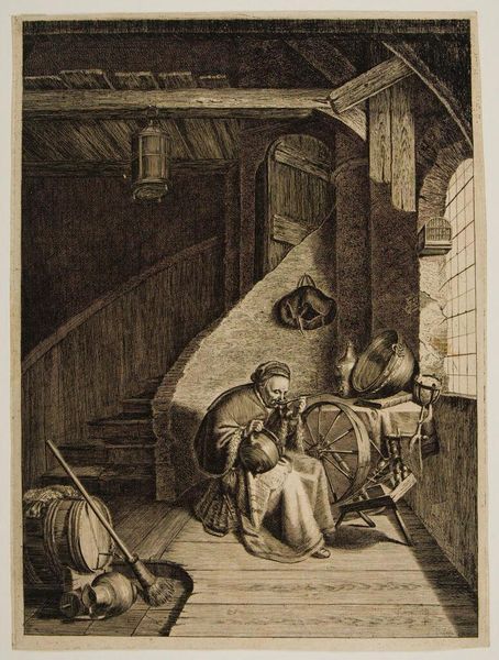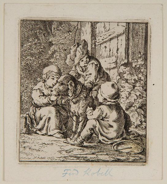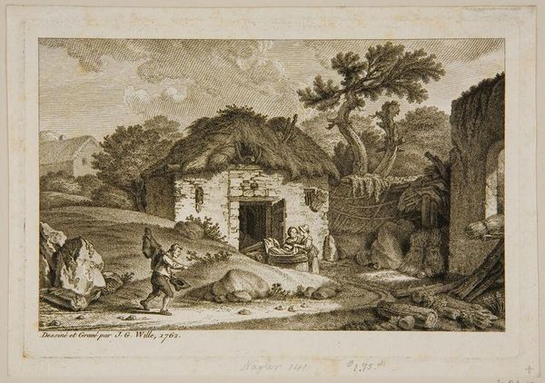 Editor: This is "Obstinate Child" by Johann Georg Wille. It's a small, delicate print. I'm struck by the details of everyday life captured here, but also by the tension between the mother and child. What do you make of this scene? Curator: It’s a delicious slice of 18th-century life, isn't it? The way Wille renders the textures - the thatched roof, the rough stone - it's almost tactile. But look closer; what's the *real* story here? Is it just a grumpy kid, or is there something else bubbling beneath the surface about societal expectations or the challenges of parenthood? Editor: That's interesting. I hadn't considered the broader social context. It makes you wonder about their lives beyond this moment. Curator: Exactly! And isn't that what art is all about? Whispering stories that make us ponder our own.