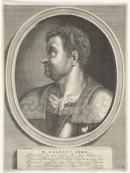 Curator: This finely wrought intaglio print offers a compelling portrait of the artist Cornelis Cort. It’s attributed to Gijsbert Van Veen and dates between 1578 and 1936, a fascinating span, isn't it? Editor: It strikes me as severe. The tight, curling hair and the precise ruff… it’s a very controlled image. I sense a great deal of Renaissance stoicism. Curator: Cort was, indeed, renowned as a highly disciplined engraver himself, known for his technical skill. Perhaps van Veen sought to capture that rigor in his portrayal. All those meticulously etched lines! Editor: Exactly. And that elaborate frame around the portrait... almost like a stage. He's presenting himself very deliberately. What's with the Latin inscriptions? Curator: Ah, they're essential. "Cornelius Chores Olavden. d’Hore Areav. Formar. Inci." It emphasizes his origins in Hoorn. He’s laying claim to his identity and artistic legacy. It is interesting that underneath there's a dedication by Iacobo Cunynch to patronage which creates another layer of significance. Editor: Patronage, absolutely key to the Renaissance. I can imagine Cort painstakingly controlling the light and shadow on his face while in Rome, aware that the slightest variation would change the impression. But you know what, I find some softness behind the seriousness of his gaze that hints on his inner, playful world. Curator: I couldn’t agree more. Those eyes… there’s a real humanity there despite the formal presentation. Van Veen captured something very personal beneath the surface of the public figure. I sense Cort would feel deeply acknowledged. Editor: In many ways, I see myself in this portrait too: striving to control and define an idea through carefully chosen forms, until one lets something wild slip in. Curator: Yes, letting our individual perspective show after a meticulous and long labor feels somehow comforting to remember. Thank you for highlighting such interesting aspects of this amazing intaglio work!