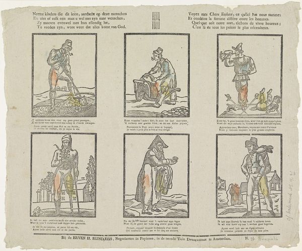 Curator: This curious engraving, titled "Deez' knapen zoeken hun vermaak…" – quite a mouthful, roughly translating to "These lads seek their amusement…" – comes to us from the mid-19th century, crafted by T.J. Wijnhoven-Hendriksen. It resides here at the Rijksmuseum. Editor: Oh, this has such a quaint, storybook charm! It feels like peering into a series of snapshots from a bygone era. Kind of naive, almost—with a sweet simplicity. Curator: Indeed. These printed sheets served various functions: from moral instruction, to pure entertainment for children. The artist was based out of Rotterdam, during the early age of children's mass media and popular literacy. The images depict children playing—the variety of scenes quite striking, each paired with rhyming verse. Editor: I like how each small window feels almost complete, with its own contained action. But viewed together, the boys are unified through their joy of movement and the activities of their childhood. They seem very content, but there's also a subtle current of contained mischief running through some of the images, would you agree? Curator: An important element is the relation between labor and childhood "play". One panel shows a kid with the caption saying how he would rather not be cleaning and the verses of another stating his happiness to work at a table. Its message feels layered to me. It tells about different types of work. Editor: Absolutely! This work feels almost alive, doesn't it? It's that mix of mundane and extraordinary, simple acts with so much human detail packed into each little window. There's always a story wanting to break out. Curator: Considering its origins, one cannot separate this art from the rise of an imagined “Dutch Childhood,” one fueled by cultural nostalgia, but also aspirations of bourgeois social uplift. Editor: Looking at the artwork like that gives another perspective to those children's entertainment that usually have underlying moral messages to be absorbed. Curator: A lens of analysis on historical childhoods often proves interesting in a lot of genre scenes, wouldn’t you say? Editor: Undoubtedly so! That definitely added layers to my appreciation!