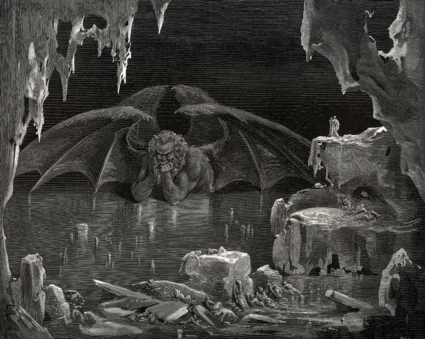 Curator: This dramatic engraving, simply titled "The Inferno, Canto 22", is by the prolific artist Gustave Dore. The precise date of its creation seems unrecorded, but it unmistakably illustrates a scene from Dante’s epic poem. It really arrests the eye. Editor: Absolutely, it's a stark and immediate image. The churning water, the monstrous demon, it’s almost overwhelming. The composition throws you right into the thick of Dante's nightmarish vision. A visceral spectacle. Curator: Visceral indeed! Observe the almost cartoonish demon, contrasted with the contorted form of the man he carries; it speaks to the psychological torment experienced in Dante's hell, almost as a symbolic, distorted reflection of inner demons rather than external ones. The fall suggests spiritual destitution. Editor: Right, and the scale here contributes to the emotional impact. The tiny figures of Dante and Virgil in the upper left corner… they’re detached observers, highlighting humanity’s vulnerability when confronted by systemic corruption and evil. Isn’t it telling how those in power are safe while the governed are thrown to hell? Curator: An incisive observation. The figures' safe position allows the artist to reinforce Dante’s condemnation of political corruption through imagery. The demon carries off what appears to be a generic human figure that suggests universality; such artistic choices turn Dante’s experience into a visual moral lesson about humanity's weaknesses, made accessible to 19th-century viewers. Editor: Yes! The fact that Dore chose to depict this particular canto likely says a lot about the societal issues that resonated during his own time. I am quite interested in what kind of imagery he selects in order to convey some implicit criticism! Curator: It makes me think of how potent symbolic imagery can be in reminding society of moral values and providing context. The narrative, carried through visual signs, makes its point effectively through the emotional register. Editor: It truly makes you question not just your individual morality, but the structural inequalities embedded in human systems. Curator: Dore definitely prompts that inquiry. This illustration continues to resonate through cultural memory, an artifact speaking volumes about moral panic, artistic intentions and public sentiment then and today. Editor: Indeed. It certainly gave me a lot to chew on. A potent illustration.