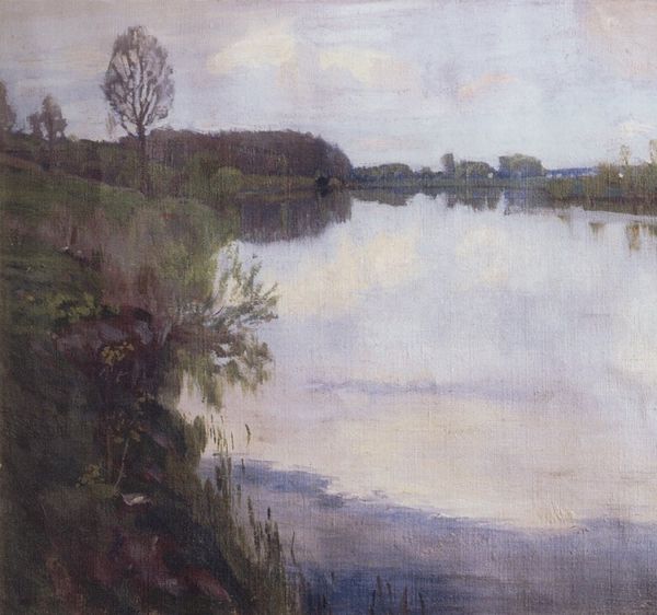 Curator: Claude Monet's "Printemps à Vétheuil," painted in 1881, offers a compelling snapshot of the French countryside during springtime. Editor: The cool, muted palette immediately gives me a sense of melancholic tranquility, like the stillness just before a spring rain. And the reflections in the water almost perfectly mirror the landscape. Curator: Indeed, the mirrored reflection is a crucial compositional element. It blurs the boundary between the real and the represented, a theme recurrent in late 19th-century Impressionist art, and offers an early example of work completed 'en plein air.' The transient atmospheric conditions Monet captured highlight the burgeoning environmental awareness of the period. Editor: You can certainly see that Monet constructed this scene from layers of colour. Look at the banks and distant hillside - lavender, olive, sienna –it's not a photorealistic study. Curator: This technique underscores Monet’s revolutionary rejection of academic tradition in favour of sensory immediacy and the socio-political shift toward valuing subjective experience in art. Editor: I’m captivated by how the brushstrokes themselves almost become the subject matter; thick impasto in places, creating a texture that reflects the density of the foliage. It’s interesting how Monet uses this interplay to express the very essence of the season. Curator: I think seeing this in the context of the rapid urbanization and industrialisation of France, Monet’s work serves as a cultural preservation project. These works were intentionally accessible, aiming to reach an emerging bourgeoisie through art and depicting a landscape becoming rapidly mythologized. Editor: Considering that, I now see those slightly taller buildings near the village church acting almost like stand-ins for the encroaching influence of technology or commerce. It is an extremely subtle piece! Curator: Precisely. A perfect example of how the personal and political are interwoven within Impressionism. Editor: This really encourages one to pause and simply contemplate the subtle shifts in colour, the fleeting effects of light—an opportunity to immerse oneself in a moment.