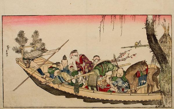 Curator: This print, attributed to Kubo Shunman, is called "Carrying Lunch to Rice Planters." Look at those figures in the distance. Editor: There's an immediate sense of serenity; the muted palette and gentle lines suggest a peaceful, perhaps idealized, rural life. Curator: It certainly speaks to a certain social harmony. The figures carrying lunch appear to be delivering sustenance to those planting rice, a vital activity. Consider the implied relationship between these groups. Editor: And the rice planters themselves are presented as a collective, almost uniform group. Their large hats look like shields and hide their individuality. Curator: Yes, the hats create a visual rhythm, symbolic of collective labor. The act of carrying lunch transcends mere sustenance; it's a social act. Editor: It’s a visual poem about community and labor, though perhaps with a touch of romanticization inherent in its cultural representation. Curator: Indeed, a powerful encapsulation of a time and its values. Editor: A serene glimpse into the past—food and life given and shared.