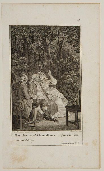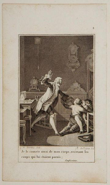 Curator: This engraving, by Jean-Louis Delignon, is titled "Oh Julie, my Julie, the veil has been torn away, and seeing it, I seem to see you again!" Editor: The figure's dramatic gesture immediately suggests a moment of intense emotion, almost theatrical in its presentation. Curator: The title gives us insight into that emotionality. Veils, in art, often symbolize secrecy or illusion. The tearing away implies a sudden, revelatory unveiling of truth, doesn't it? Editor: Precisely. Considering the period, one might interpret the figure's grief and invocation of "Julie" through the lens of lost love and societal constraints on expressing that grief. Were same-sex relationships more veiled then? Curator: It's fascinating how personal grief intersects with these broader social anxieties. The image, while small, speaks volumes about the pain of loss, and the symbols that attempt to contain that pain. Editor: Yes, it leaves me pondering the many "Julies" throughout history whose stories remain obscured.