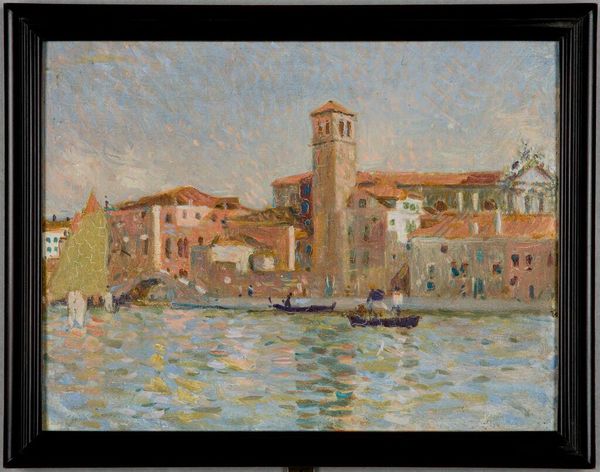 Curator: Denman Waldo Ross created this evocative painting, simply titled "Venice." I see a city, and I see a site layered with histories of trade, cultural exchange, and political intrigue. Editor: It immediately strikes me as a study in muted tones and reflections. The water seems to mimic the buildings above, almost dissolving the solid forms into liquid light. Curator: Right, and thinking about Venice, the city itself has often been a reflection of power structures. Consider the role of the Doge's Palace, for instance, and its connection to systems of governance and social control. Editor: I'm drawn to the brushwork—loose, impressionistic. How do you think this technique contributes to the overall feeling evoked by the image? Curator: I see it as Ross grappling with the legacy of Orientalism, trying to capture a sense of the exotic while also acknowledging the complexities of representing another culture. Editor: For me, the hazy atmosphere and blurred edges suggest a dreamlike quality, a Venice filtered through memory and imagination. Curator: It's a conversation starter, inviting us to consider how places shape our perceptions. Editor: A wonderful dance of color and form. I think I understand this piece so much better now.