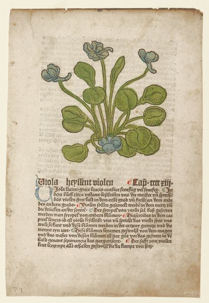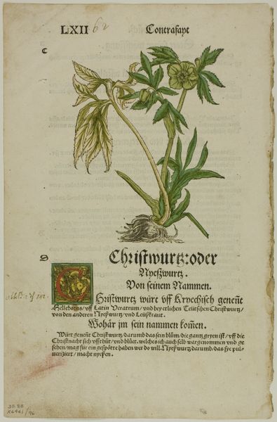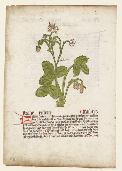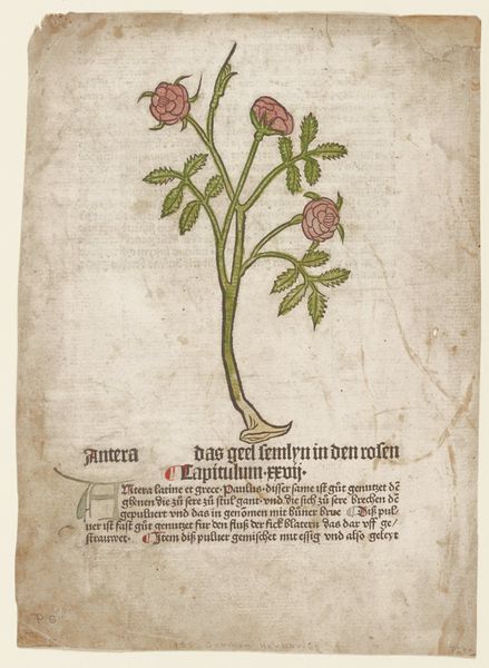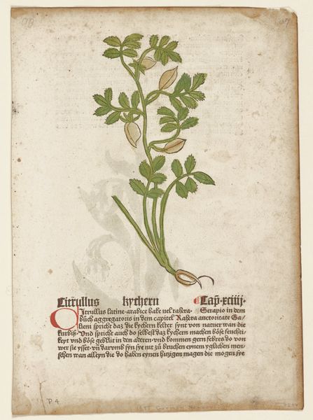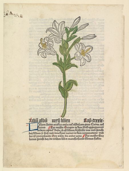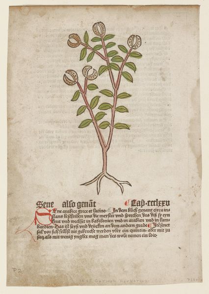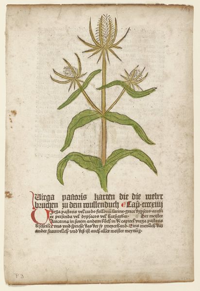 Editor: This is "Agnus Castus," made around 1485 by Johannes de Cuba. It’s a woodcut print with ink on paper. I'm immediately struck by how practical it seems—almost like a page ripped from a botanical guide. What do you make of its stark simplicity? Curator: It's interesting you see it that way. I see a confluence of medieval scholasticism and the rise of early printing. Think about the societal role of knowledge at the time. Illustrated herbals like this were instrumental, weren’t they, in democratizing information. The printing press enabled broader access, shaping public understanding of medicine and the natural world. Consider who might have owned this and what power came from possessing such knowledge. Editor: So, not just a straightforward guide, but also an object reflecting societal structures and power dynamics? Curator: Precisely. The clean lines and seemingly objective depiction belie a more complex story. What about the language used in the print? Does that give you a clue? Editor: Yes, it's Latin! Which likely meant that it was created for use amongst educated people in medieval Europe. It is like a statement that some people were meant to have this knowledge, while others did not. Curator: Exactly. Its design also reflects the aesthetics of the time. The very act of preserving and disseminating this sort of practical, botanical knowledge had social implications. How does understanding the social history impact your impression? Editor: It completely reframes my understanding. Seeing it not just as an objective document but as a product of its socio-political environment makes it much more fascinating. Thank you for your insight!