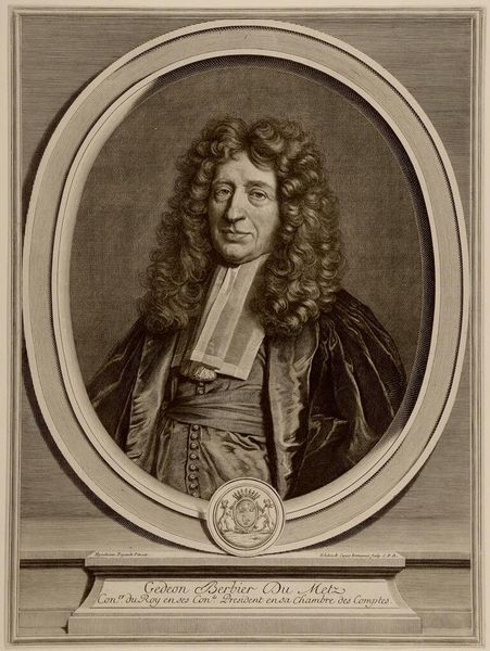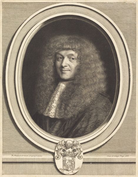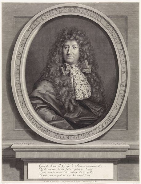 Editor: Here we have a portrait of Nicolaas Heinsius I, Poet and Professor at Leiden, Envoy of Queen Christina of Sweden, painted by Jan Maurits Quinkhard sometime between 1723 and 1771 using oil paints. It’s the oval frame that I find really striking; it feels very ornamental and contributes to the intimate scale of the artwork. What aspects of the visual composition do you find most compelling? Curator: Indeed, the interplay between the figure and the frame is critical. Consider how the artist utilizes tonal gradations to sculpt the face, achieving a remarkable verisimilitude. Note, also, the texture. Observe the layering of paint. Is the paint applied smoothly or with visible brushstrokes? Consider, then, what the texture suggests about the artist’s technique and their intended affect. Editor: I see what you mean about the texture and how the artist clearly tried to balance detail and smoothness. Are you also implying something about Quinkhard's intent in highlighting certain materials? Curator: Precisely. Quinkhard’s strategic deployment of light and shadow defines the pictorial space, foregrounding specific compositional elements. Semiotically, the contrast between light and shadow produces the primary affect within the work; it establishes the power relationships. Editor: So, through close analysis, we can find not just visual interest but layers of meaning through his technique. I'll have to look more at Baroque portraiture from a material perspective now. Curator: I encourage you to investigate Quinkhard’s engagement with earlier art traditions, identifying common methods of portraying status through light and shade. Now that you're focusing on materiality and composition, what overall impact might that have on your initial assessment?