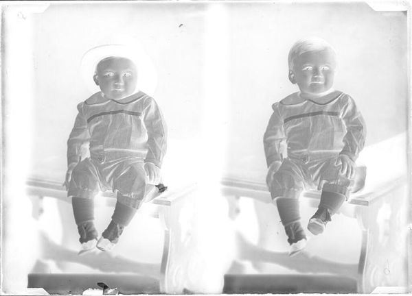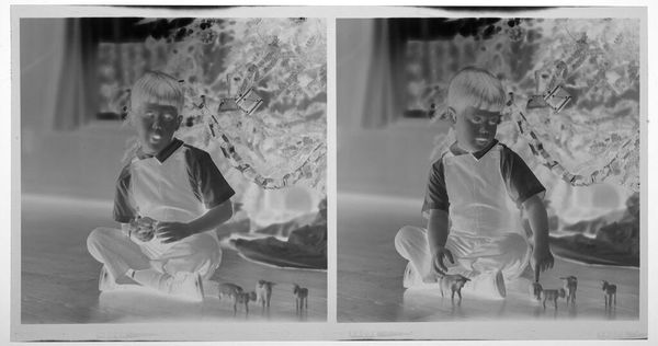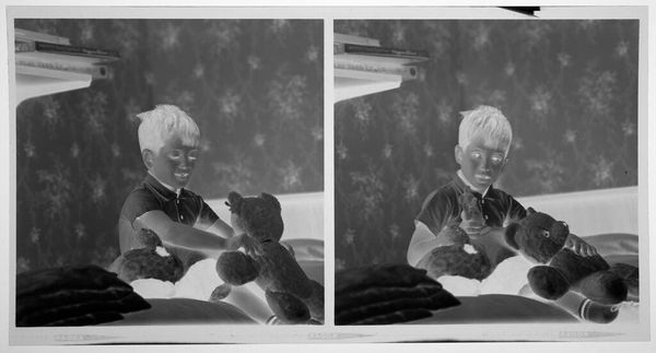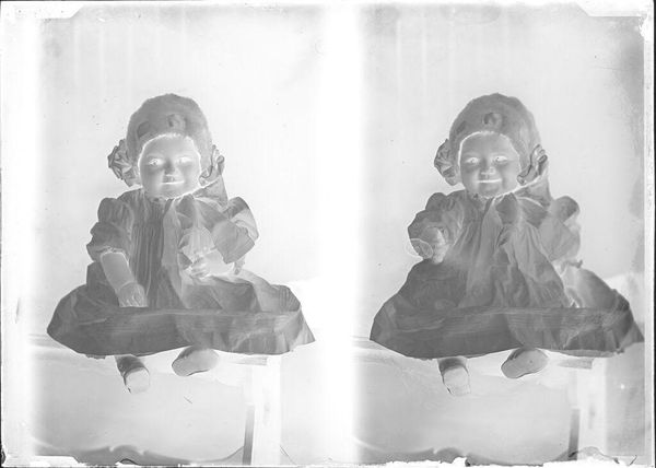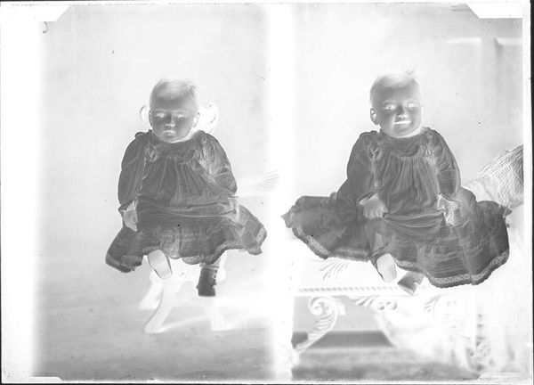 Curator: Before us, we have John Deusing’s photograph, presently titled "Untitled (two portraits of baby)", housed here at the Harvard Art Museums. It presents, as the title suggests, a mirrored image of a baby, about 5 x 7 inches in size. Editor: My initial reaction is the unsettling juxtaposition of innocence and starkness; the inverted tones create an almost ghostly atmosphere. Curator: Indeed. The negative photographic process itself bears significant historical weight, suggesting the evolution of portraiture and the democratizing potential of photography in rendering likenesses. Editor: Yet the rigid framing and identical poses seem to negate individuality, almost objectifying the infant. Was this a common practice, to standardize childhood in such a way? Curator: Certainly, the act of photographing infants was becoming common. Such portraits become artifacts of a burgeoning middle class striving for social mobility and employing visual mediums to solidify their place. Editor: The visual polarity between subject and process here really gives pause. It prompts an investigation into the aesthetic and historical narratives embedded in this seemingly simple portrait. Curator: Yes, a compelling piece prompting questions about representation, technology, and the construction of identity.