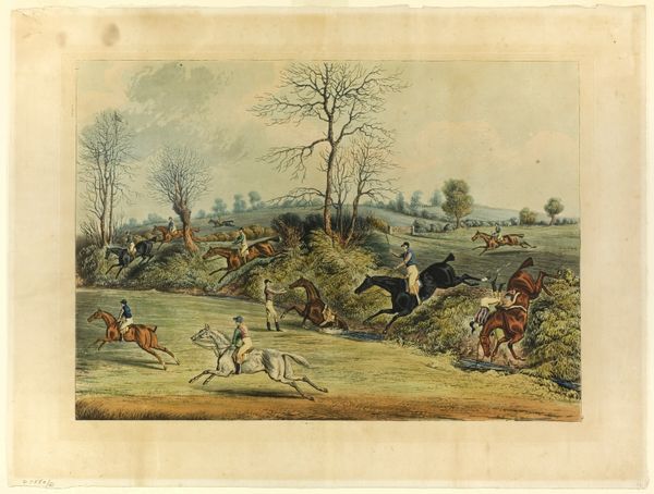 Editor: So, this is George Catlin’s "Buffalo Hunt," created around 1844. It seems to be oil paint and watercolor on some sort of print. It feels like I'm looking into a chaotic but incredibly active scene, a freeze-frame of a hunt in motion. The energy is almost palpable. What captures your attention when you look at it? Curator: What a splash of life, eh? It reminds me a bit of trying to catch a runaway thought—that primal rush of pursuit, a storm of dust and adrenaline frozen mid-tempest. What gets me are those wisps of smoke suggesting recent shots. What do you make of it? Editor: It’s intense! Almost like a documentary photograph, but rendered in paint. What's fascinating is how the landscape almost becomes secondary to the human (and animal!) drama unfolding. The violence feels somehow... necessary, as odd as that sounds. It feels a million miles away from our everyday existence. Curator: Exactly! Catlin wasn’t just painting pretty landscapes; he was trying to document a vanishing world, a clash between cultures and ways of life that felt brutally urgent even back then. He wanted to preserve a record of Indigenous customs and traditions. He really dove in head-first, didn’t he? A bit of an early anthropologist. Editor: It's a snapshot of history, almost a warning. Did Catlin have any real connection to the communities he depicted, or was he more of an outsider looking in? Curator: Ah, there’s the rub, isn’t it? He spent a good chunk of the 1830s living amongst various Plains tribes, and even adopted some of their customs and dress. But whether he fully *got* it, is another question entirely. I bet if we could hear from the hunted buffalo their perspective would be wildly different... Anyway, he brought images of these Indigenous communities to people who didn't otherwise have access to see these images. How does knowing all that shift how you see the work? Editor: It definitely complicates things. It makes me think more about the ethics of representation and who gets to tell whose story. It’s beautiful but problematic. It's about looking *and* reflecting! Curator: Couldn't have said it better myself! It's a piece that stays with you, precisely *because* it isn't simple. Art isn't here to tell us fairytales.