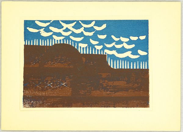 Editor: This is Henri Hayden's "Courtablon," a print in the Tate collection. I’m struck by how the blocks of colour create a sense of depth and distance, despite the flatness of the picture plane. What underlying symbols or imagery do you see at play here? Curator: Notice how the landscape is reduced to these essential forms. The colours are quite earthy. The red rectangle is interesting, drawing your eye, while the brown and green colours provide a sense of stability. Do these colours evoke particular memories or feelings for you? Editor: I see the red as a signifier of human intervention, interrupting the pastoral, perhaps even a symbol of modernity encroaching on tradition. Curator: Yes, it’s a potent symbol. Consider how Hayden uses these flattened forms, building upon Cubist vocabulary, to construct his own visual language of memory and place. Editor: I didn't expect to find so much symbolism in such a simple composition. It’s made me think about how colours carry cultural significance. Curator: Indeed. It is about decoding the symbolic language artists use to express deeper meanings and create connections across time and cultures.