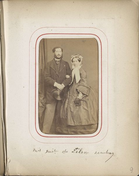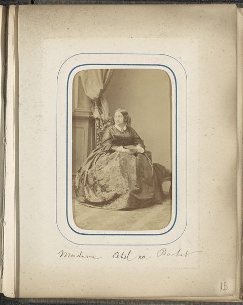 Curator: This is a gelatin-silver print, dating from around 1860 to 1865. The piece is entitled "Portret van jonkvrouw De Valencay met Dolly op de arm," a portrait of Miss De Valencay with a doll in her arms, the artist being A. Schamberg. Editor: The composition feels a bit rigid to my eye, almost staged, a common thread of the early photographs in that century. The muted tones contribute to its somber, contemplative mood. Curator: The photograph invites contemplation on several key themes, the main being how 19th-century portraits can reflect a delicate balance between personal expression and societal expectation, especially when we center gendered expectation into this reading. Editor: And observe how the doll mimics the sitter’s formal dress; it is almost as if the jonkvrouw is already training her for future roles within this restrictive society. It becomes a loaded symbol here: childhood interrupted and shaped for posterity. Curator: Exactly. Early photography provided a democratic shift allowing more of the rising middle class access to formal portraiture, traditionally only the extremely wealthy had that privilege. However, the subjects, even children like De Valencay, are consistently posed to fit the conservative ideal that upheld 19th-century structures of power. We can also note historical fashions reflected here. Editor: Consider how that heavy dress contrasts so starkly with the lightness implied by ‘dolly’. Doesn’t it speak to innocence burdened by heavy expectations of decorum and propriety? The doll itself has this look of surprise on her face; even she knows her path has been charted! Curator: You’re right to read this portrait as staged and fraught—it underscores how social roles get performed in photographic representation. In an intersectional sense, thinking about gender, class, and even generational divides feels relevant here. Editor: Yes. Reflecting upon it this way enriches my understanding. It has transformed how I see this photograph, and how potent its symbols become, as more than just a frozen moment of 19th-century childhood.