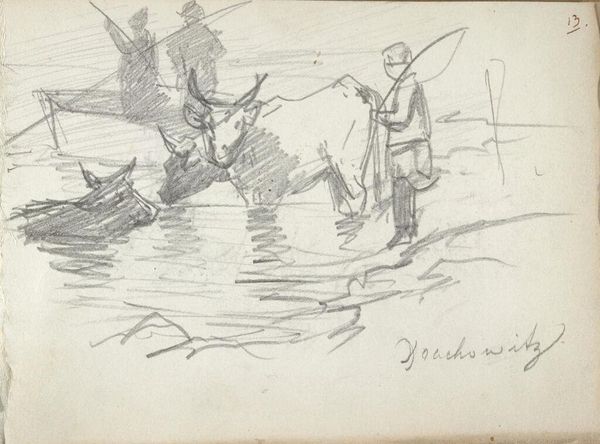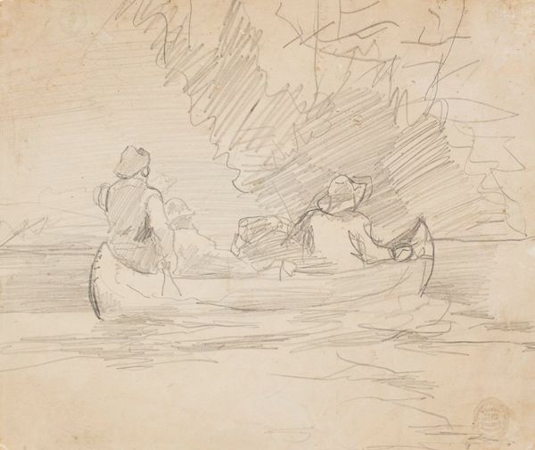 Curator: Here we have Winslow Homer's pencil drawing "Canoe with Two Men," created in 1895. Editor: My immediate impression is one of tension, of struggling against the elements. The rough strokes really convey the push and pull. Curator: Indeed. It's tempting to view this through a lens of labor, but let's dig deeper. Homer often depicted men confronting the raw power of nature. I’m interested in exploring ideas of American masculinity. Are these men working, or perhaps are they in fact being challenged? The lack of any geographical cues really obscures the social background, don't you think? Editor: That resonates. The canoe itself, an age-old symbol of travel and crossing boundaries, also represents the delicate balance between humans and the natural world. Their boat barely seems afloat in this sketchy visual field. It feels less like transit and more like uncertainty. Curator: Consider that. There's a kind of implicit drama—the question of their safety. What kind of narrative does it set up to imagine a colonial legacy, how it affects both the colonizer and colonized bodies. Editor: The drawing style further amplifies this feeling of immediacy. Those hurried marks suggests that there might have been other ways the moment of the situation presented. Curator: We must acknowledge Homer's particular perspective in relation to this history and culture. Does Homer perhaps engage here with his time period's idea of the heroic, yet without showing how men's place in society had to constantly face off against economic realities? Editor: The simplicity of the image and its symbols make me think that it taps into these deep reservoirs of collective cultural anxieties about identity. How has time weathered our ideals around American identity? Curator: It becomes apparent, considering gender, class, and time, the complexities that underpin notions of masculinity. It may look like just "two men in a canoe" to some. Editor: But look closer. Homer provides an echo of visual signs and symbolism. Curator: Leaving the viewer to ponder its endurance and continual challenge.