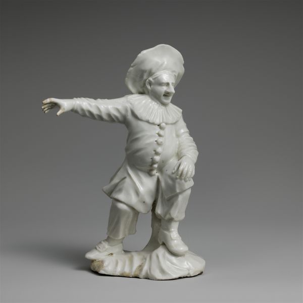 The Höchst Manufactory crafted this porcelain figure titled Cynthio. Standing at just over eight inches, the figure strikes a jaunty pose atop a geometrically-shaped base. The composition is dominated by soft pastel hues. The figure's rust-coloured coat contrasts with his white shirt and stockings, creating a delicate balance. The black shoes and hat add visual weight, grounding the piece and drawing the eye downward. This careful color balance is not accidental. In the 18th century, porcelain figures were more than mere decoration. They were signifiers of wealth and taste. Note how the figure's stance, with one hand raised, exudes a sense of theatre and artifice. This theatricality is further emphasized by the figure's elaborate costume, with the attention to detail in the folds of the fabric and the delicate lace cuffs. This figure operates within a complex semiotic system. Every element from the color palette to the figure's pose, is laden with meaning. It serves not just as an aesthetic object but also as a reflection of its time, embodying the values and aspirations of the society that produced it.