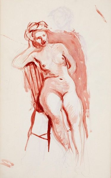 Curator: Dante Gabriel Rossetti's "The Rainbow," executed in 1876, offers a beguiling vision. Editor: My initial reaction is one of… fragility. The medium, pencil, lends itself to delicacy, yet the figure’s pose has a strange monumentality. It's an interesting tension. Curator: Indeed. Rossetti, steeped in Pre-Raphaelite symbolism, often explored themes of idealised beauty and melancholy. The rainbow itself, while absent in chromatic reality here, implies a bridge, a connection, or perhaps a fleeting promise. Editor: Focusing on process, one must acknowledge the sheer skill required to render such soft textures and subtle gradations with a simple pencil. The very act of building up these layers, the physical labor… that speaks to a pre-industrial mode of making. Each mark is deliberate. Curator: Absolutely, and within the broader context, we have to consider the symbol of hair. Here it acts as a sort of shroud. The gesture of the figure as well is classicized. Is she revealing or concealing herself, perhaps something unknowable or intangible? Is she Iris? Editor: Materially speaking, pencil is earth itself, refined into a tool. Looking at Rossetti's method, he seems intent on pushing the humbleness of pencil, challenging artistic hierarchies and production value. The lines curve; he really makes a conscious effort. It looks very soft like it could move with the wind. Curator: This drawing allows a certain interpretation because the symbolic and visual elements form an overall impression. Even without colour, we sense its ethereal presence. The rainbow arc almost reads as a halo, or a cage perhaps depending on our perspective. It resonates even today. Editor: "The Rainbow" challenges our expectations of finished art and offers something intimate through the simplicity of its materials. It encourages close contemplation. Curator: An intimate contemplation, echoing far beyond its material form into realms of myth, loss, and longing.