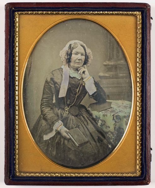 This is a portrait of an unknown woman with a bonnet, captured by Henry Death using the photographic technique of daguerreotype. The bonnet, a seemingly simple head covering, is a potent symbol, a form of attire that has traversed eras and cultures. In earlier times, similar head coverings signified modesty and marital status. Think of medieval depictions of women, their hair concealed, or even the veils of nuns. The reappearance of the bonnet here speaks to the cyclical nature of symbols. The bonnet may have lost some of its religious connotations, but the sense of decorum remains. The woman's composed demeanor, coupled with the bonnet, creates an image of matriarchal strength. It resonates with the archetypal mother figure, a representation of security and unwavering presence. This image pulls us into a subconscious dialogue, one where cultural memory shapes our interpretation and elicits a deep, emotional response.