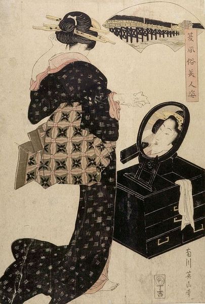 Tsukioka Yoshitoshi's woodblock print captures a domestic scene from the Bunsei era, focusing on a housewife in repose. The subdued color palette and the intricate patterns on her kimono create a visually rich surface. The composition is structured around the diagonal line formed by the woman's posture, leading the eye from the top right to the lower left corner. Yoshitoshi uses the traditional Ukiyo-e style to explore themes of beauty, domesticity, and fleeting moments of everyday life. The careful attention to detail in the textile patterns and the arrangement of the woman's hair introduce a play between surface decoration and deeper cultural meanings. The intimate portrayal, with her head resting on a small table, invites contemplation on the woman's inner world and her place within the social structures of the time. This print destabilizes conventional notions of beauty by presenting a candid, unidealized image of a woman, emphasizing the formal aspects of line, color, and pattern as crucial elements in conveying emotion and narrative.