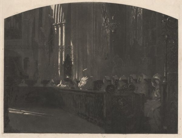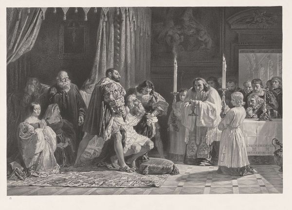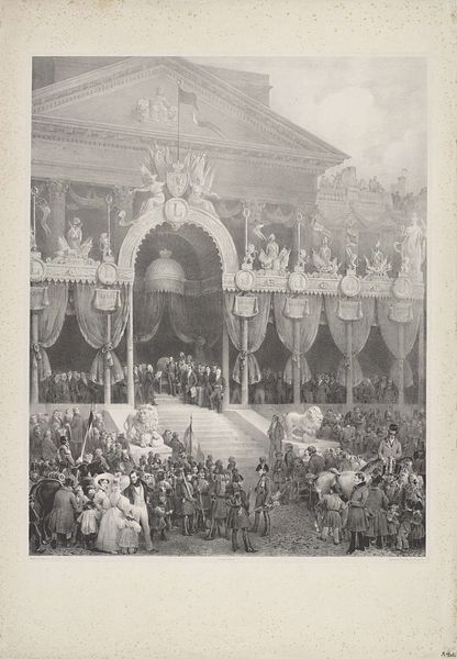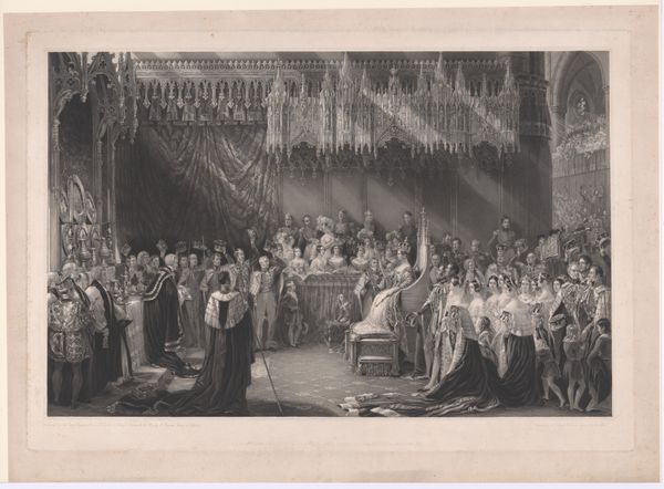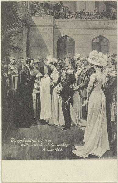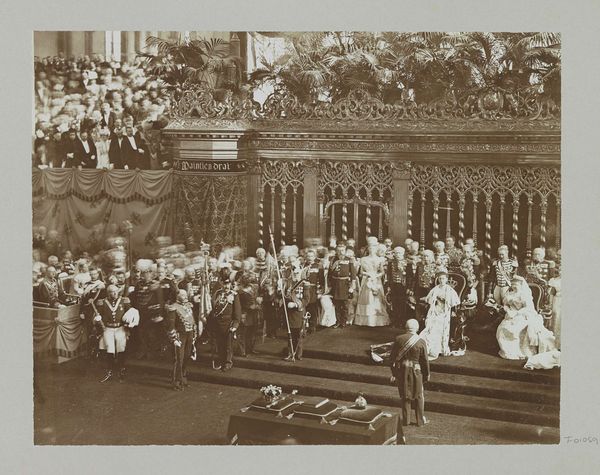 Curator: This photograph, believed to be from 1898 or 1899, depicts the inauguration ceremony of Queen Wilhelmina in the Nieuwe Kerk in Amsterdam. The studio behind it is Guy de Coral & Co. Editor: It's striking! The density of the composition, the sheer number of figures crammed into that space… it speaks to the immense weight of the occasion, literally and figuratively. And the ornate backdrop is beautiful. Curator: Absolutely. Inaugurations, historically, have always been carefully staged events. The architecture, the dress, everything serves to reinforce power and legitimacy. In Wilhelmina's case, succeeding her father at such a young age, this visual representation was even more vital. Think about the significance of that church itself. Editor: You can almost feel the layers of varnish. What is especially interesting is imagining what sort of apparatus captured the event. I find it fascinating to consider the technical labor that went into capturing this moment. Developing those large glass plates under pressure— Curator: It's also worth thinking about how the image functions as propaganda. These images, and who had access to them, shape public opinion. They project strength and continuity during moments of change. Editor: I also think that materiality tells a story. The choice to use photography, in contrast to painted royal portraits—it's interesting that new photographic technology was capturing the old spectacle of royalty. Curator: Photography was gaining popularity, which democratized visual access, but still allowed carefully constructed narratives to be pushed, shaping the narrative. It projects continuity, progress... but does it reflect the lived reality of the Dutch people at the turn of the century? Editor: Ultimately, these types of photos function to memorialize the monarchy and celebrate craftspeople who produced regalia as opposed to revealing reality. Curator: I agree. And in examining those objects within the picture, one sees their power reflected onto Wilhelmina herself. The historical impact, solidified in image, available for consumption, even now. Editor: A frozen, perfectly posed spectacle designed to obscure the human processes required to make the spectacle even possible. Curator: It does give us a powerful image of the dawn of the new reign, however manipulated. Editor: A potent reminder of how deeply intertwined labor, power, and visual culture always are.