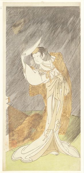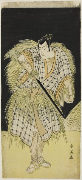 Katsukawa Shun'ei created this woodblock print of "The Second Nakamura Nakazo" now at the Metropolitan Museum of Art. The composition arranges the figure vertically against a muted landscape of gray and yellow, dominated by linear textures. The actor is captured mid-motion, his form partially obscured by a cloak of radiating lines. Notice the dramatic use of line. Shun'ei employs both fine and bold strokes to define the figure and costume. The radiating lines of the cloak contrast with the geometric pattern of the kimono underneath. This interplay destabilizes our perception, blurring the boundaries between costume and character. The diagonal thrust of the figure is destabilizing. The actor's intense expression, framed by dark hair, conveys a sense of inner turmoil, challenging fixed notions of performance and identity. Shun'ei's dynamic use of line not only renders the visual details, but also destabilizes the viewer's understanding of the performance.