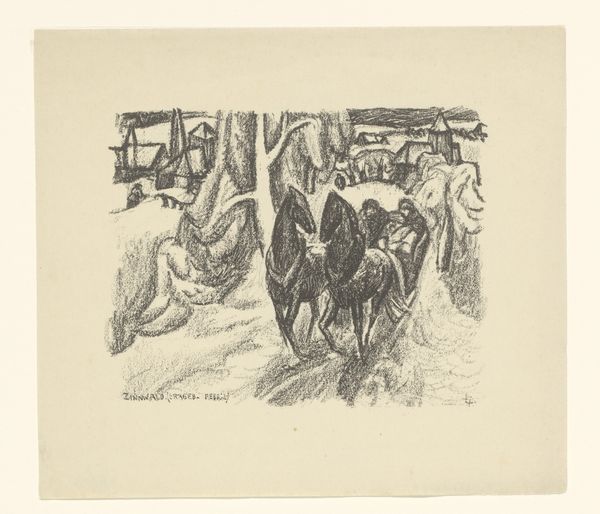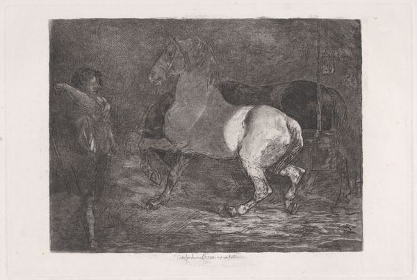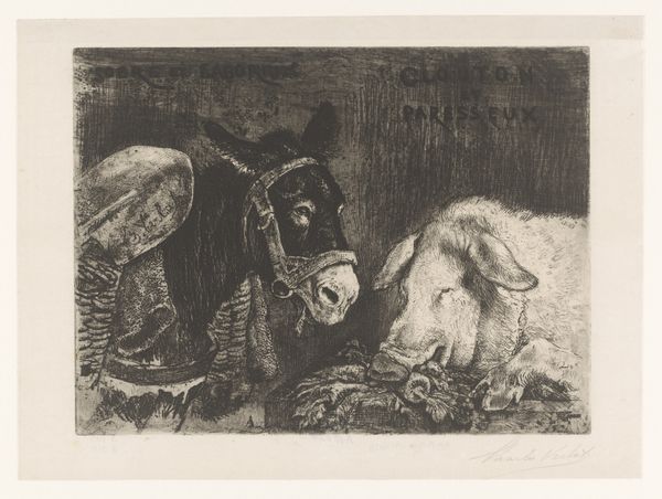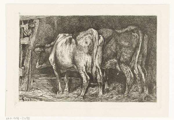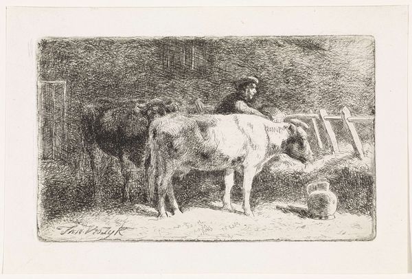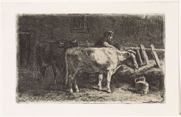 Curator: Ah, there’s a gentleness to this, wouldn’t you say? Like stepping into a quiet dream of farm life. Editor: Indeed. Here we have H.P. Hansen’s "Stald med Kalve", likely created sometime between 1829 and 1899. It’s an etching, or possibly an engraving – a detailed print pulled from an incised plate. A rather subdued piece in the collection. Curator: Subdued, perhaps, but look at the way the light catches the calf’s back! The artist really made something wonderful out of this quiet scene. Two calves huddle inside the barn with some inquisitive chickens – cozy! What is the light telling us, formally speaking? Editor: Well, the composition directs the gaze using contrast, placing the viewer within this intimate enclosure. The tonal gradations—from the dark, cross-hatched shadows to the pale openness beyond—illustrate space. Look closely: that careful management of dark and light gives shape to this whole work! Curator: Light and shadows, that’s what makes the difference between feeling like you’re peering in and like you are actually in there with those calves! To me, Hansen invites us to pause, appreciate the simple beauty around us. To feel the rough wood, the damp straw. It’s really special! Editor: I would argue it is the meticulous rendering of texture – the meticulous linework that defines the animals’ forms, and that woven texture of the basket – which transports the viewer into this setting, beyond the anecdotal charm. Hansen plays a strategic game of depth using strictly formal elements. Curator: You’re probably right… There is something deeper happening here. A narrative unspoken, and the longer I look, the more poignant it feels. But ultimately, isn't it incredible how much emotion someone can pack into a simple, seemingly humble print like this? Editor: I would contend this etching prompts reflection on our perception and the complex relationship between the artist's eye and the object that is rendered. Curator: Makes one appreciate what's often overlooked. And that, in itself, is priceless! Editor: A rewarding task, wouldn't you say?