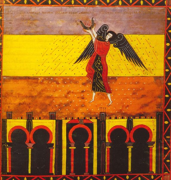 Curator: This tempera on paper work is entitled L'Ange et l'Encensoir d'or. Apoc. VIII, which translates to The Angel with the Golden Censer, Apocalypse VIII. The artist is known as Facundus, and the style places it within the realm of Byzantine art, a form strongly rooted in the medieval period. Editor: My initial impression is one of structured chaos, perhaps even an oxymoron! It’s visually very complex, but those distinct registers impose a rigid framework on what seems like a fiery, celestial event. I am really taken by the vibrant reds and deep blues-- especially set against the muted ground of what I assume is the paper support itself. Curator: You're right. It portrays a scene from the Book of Revelation. In its historical context, the apocalypse was a major theme in medieval religious art and political discourse. Imagery depicting cosmic events like this played a crucial role in conveying theological concepts and, frequently, reinforcing established societal hierarchies and the power of the church. Editor: Right, power. Looking closer, one really appreciates how the materiality enhances this effect. The tempera medium yields flat planes of intensely colored pigment. No attempt is made at shading or naturalism – a deliberate choice that I suspect aimed at immediate, overwhelming impact on the viewer. The making of it, the time and labor in applying these paints, further underscores the divine authority the work proclaims. Curator: The gold leaf details, barely hinted at here and there, would definitely have signaled its preciousness, reinforcing the theological import. It’s also worth thinking about how illuminated manuscripts were historically produced. This wouldn't have been an isolated creation, but likely formed part of a larger codex made to promote social and religious beliefs within specific networks of patrons. Editor: Yes, tracing back how the paper itself was produced would shed additional light too – who made it? Where did the raw materials come from? These questions take us beyond the immediate scene and illuminate broader systems of craft production that undergird such powerful imagery. What did this object mean in terms of its material making? Curator: Absolutely, the socio-economic landscape in which art is made shapes not just its iconography, but also the very conditions of its reception. The artist probably considered the symbolic power of such image in their process. Editor: This encounter made me realize that this picture may only present the start of understanding how production meets cultural significance.