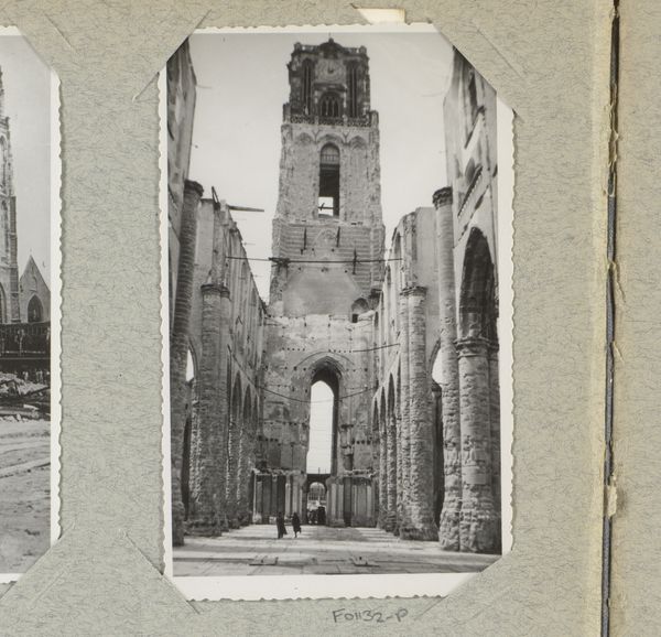 This black and white photograph by J. Nolte captures the ruins of the Zuiderkerk in Rotterdam. The stark imagery and textural contrasts evoke a sense of desolation and destruction. The composition centers on the skeletal remains of the church, its architectural form now reduced to a haunting silhouette against a light sky. Nolte uses line and form to convey a powerful message. The jagged edges of the debris contrast sharply with the once orderly structure of the church, creating a visual discord that mirrors the chaos of war. The monochromatic palette further emphasizes the stark reality, stripping away any distraction of color. This photograph, with its somber tone and ruinous imagery, invites us to consider themes of loss, memory, and the fragility of human achievement. It challenges conventional notions of beauty and order, and the semiotic elements of destruction serve as a poignant reminder of the transience of existence.