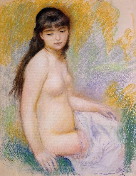 Editor: We're looking at Pierre-Auguste Renoir’s "Standing Bather" from 1887, an oil painting seemingly capturing a candid moment. The soft, blurry background gives the piece an intimate feel. How would you interpret the cultural context behind a work like this? Curator: It's crucial to consider the evolving role of women in art and society. While Renoir doesn't challenge the male gaze outright, he offers a slightly different representation of the female nude than, say, academic painters of the time. He places her outdoors, in a natural setting, hinting at a liberation, though still within the bounds of acceptable subject matter for the period. Think of the art market and who was buying these paintings - upper middle class men mostly. Would this painting hang in a public space, like a government building? Unlikely. Editor: So, its artistic merit depends, in part, on its relationship to the societal expectations of its time? Curator: Precisely. And consider how Impressionism itself was initially received - as radical! So even a seemingly conventional subject like a nude bather, when rendered with loose brushstrokes and a focus on light and atmosphere, could be interpreted as a subtle form of rebellion. Was it truly a revolution in art, or simply a palatable, bourgeois form of innovation that appealed to wealthy consumers who also thought themselves “modern?” Editor: I see your point. I guess it is never just *about* the art. There's so much context wrapped up in a piece like this, it completely shifts the perspective. Curator: Absolutely. And these paintings are meant for particular kinds of spaces. The Salon exhibitions dictated taste and set the standards for what art would matter in those days, giving great influence to who showed what. Now think of our own time – which artists receive this attention, from which museums and curators, and with whose resources? Editor: Food for thought, certainly! I'll definitely be considering context much more deeply from now on.