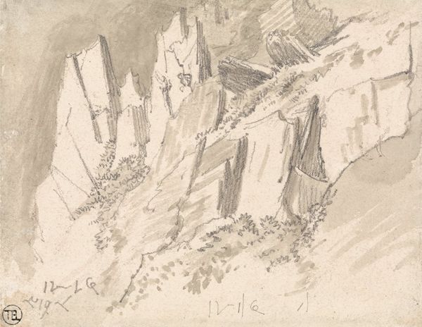 Curator: We’re looking at "Figuur op een pad in het Haagse Bos," a pencil drawing by Johannes Tavenraat, created in 1871. It resides here at the Rijksmuseum. Editor: Wow, it’s kind of…haunting, right? All those stark tree trunks and a lone figure disappearing into the woods. Feels a little melancholy. Curator: Yes, Tavenraat certainly captures a specific mood. Consider the romanticism at play, the emphasis on nature’s grandeur and humanity's small scale within it. Notice how the verticality of the trees establishes a rigid structure while the soft pencil strokes render a very yielding forest floor. Editor: I see what you mean about the structure; it’s almost architectural. But that little figure? He’s the whole story for me. Where is he going? What’s he thinking? Is it cold? The mind wanders in those woods, doesn't it? Curator: Indeed. That figure offers a point of entry, inviting speculation, yes. I am interested in how Tavenraat uses line weight to suggest depth; note the economy with which the artist has constructed an atmospheric perspective. This exemplifies the period's inclination for detailed landscapes enlivened by intimate, almost genre-painting elements. Editor: Genre elements indeed. You almost miss him there; it also plays with themes of solitude and maybe the sublime. What about the way Tavenraat used the negative space here, especially at the top? All those bare patches of paper feel like a raw invitation. It’s like the drawing’s not quite finished… intentionally, I think. Curator: That very rawness is essential; the piece functions as a preliminary exploration of form and space, encapsulating the Romantic sensibility of imbuing natural forms with emotional content. It reflects broader philosophical and artistic currents, particularly an interest in conveying an immediacy of experience. Editor: It certainly has that effect. It makes you wonder if Tavenraat was actually *there* at that precise moment… feeling the cool damp of the forest and scribbling his way through the bracken. Thanks. I am strangely ready to read some Thoreau. Curator: The emotional connection certainly remains even today. This drawing remains significant as a prime example of late 19th-century Romantic landscape practice.