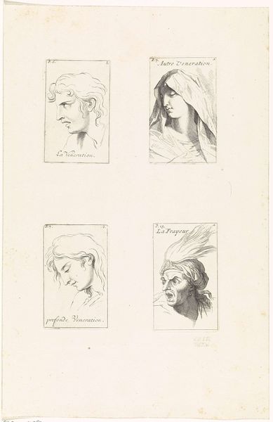 Editor: This drawing by Bernard Picart from 1711, titled *Voorstellingen van verschillende emoties*, translates to 'Representations of different emotions'. It’s done in ink on paper, and the mood is immediately striking – such dramatic expressions! I'm curious, what captures your attention when you look at this piece? Curator: It feels like peeking into Picart’s mind, doesn't it? As if he's charting the raw landscapes of human emotion. Notice how each face is framed, like a little stage for a particular feeling to play out. "La Colere," twice over! He's really diving into anger there, isn't he? Raw, almost comical rage! The exaggeration in the first two is like… well, have you ever felt your anger taking on a life of its own, like a theatrical performance of fury? Editor: Absolutely! The top two are pure drama. But then, the bottom right, labelled "La bête" seems quite different, almost serene. Curator: Ah, but "bête" can be both 'beast' and 'fool', can’t it? Is it rage refined or a vacant, foolish passivity? Look closer. Perhaps she isn't so serene; a sort of muted fury lies beneath. Makes you wonder what stories he saw in the faces around him. Don’t you find yourself doing the same, projecting emotions onto people’s faces as you pass them on the street? Editor: Definitely! It's like he’s giving us permission to be theatrical. And maybe warning us about jumping to conclusions too quickly about other peoples' expressions. Curator: Precisely! He's inviting us into this very human game of feeling and seeing and mis-seeing. And that playful darkness makes this Baroque piece still pulse with life today, wouldn’t you say? It’s nice when art makes us see a bit of ourselves in others – anger and serenity included. Editor: It really does. Thanks, I'll definitely be looking at faces on the street a little differently from now on.