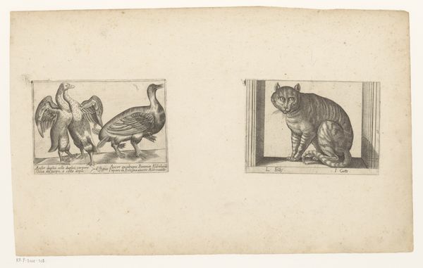 Editor: This etching by Francis Barlow features a cat, monkey, bird and other creatures, all sharing an outdoor space. There's a definite power dynamic on display. What kind of statements do you think Barlow is making here? Curator: It's crucial to contextualize this work within the era of exploration and colonization. The animals, often exotic to European audiences, become symbols. Consider the monkey, frequently chained. What does this imagery tell us about control, exploitation, and the othering of the non-European world? Editor: So, it’s more than just a picture of animals. It’s a commentary on power? Curator: Exactly! Barlow uses these creatures to reflect the social and political realities of his time, inviting us to question the dominant narratives of power. These animals aren't just animals, they're stand-ins within a complex hierarchy. Editor: That makes me see it very differently. Thank you! Curator: Of course. It's vital to think about the colonial gaze and its lasting impact on how we perceive both art and the world.