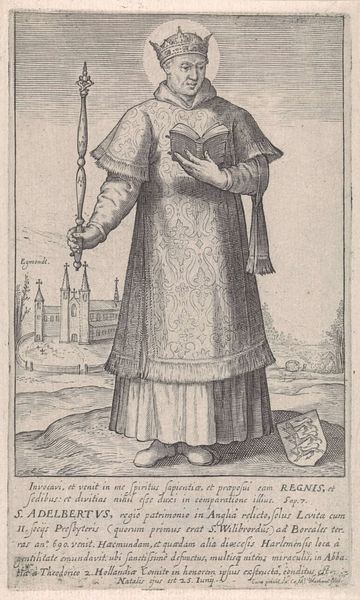 Editor: This small etching, "Saint Radegunda" by Jacques Callot, depicts the saint in great detail, despite its miniature scale. I’m curious about the decision to portray her with laborers in the background. What do you see in this piece? Curator: The figures laboring remind us to examine the material conditions of this image's production and consumption. Callot's etching process itself involved skilled labor and specialized materials, from the metal plate to the ink. How might this print have circulated and been used? Editor: Perhaps it was a devotional object for the wealthy, given the detail and Callot’s skill? Curator: Possibly, but its existence also speaks to a broader market for religious imagery. This challenges traditional divisions between "high art" and more accessible forms of religious material culture. Think about the labor involved in even owning this image. Editor: That’s a great point. I hadn’t considered the wider implications of its production and consumption.