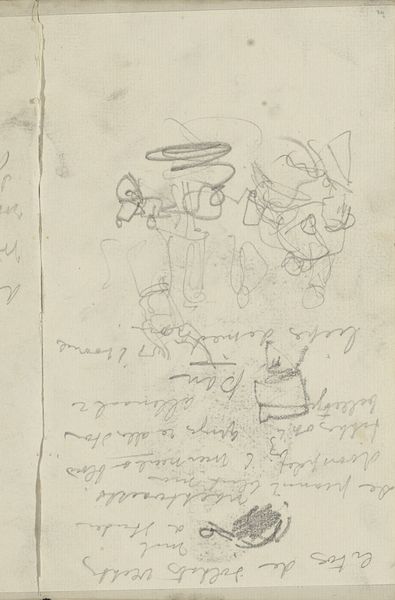 Editor: Here we have "Man Gezierd Wandelend Tussen Twee Dames," or "Man Decorated Walking Between Two Ladies," by Alfred Michael Roedstad Schmidt, made sometime between 1868 and 1907. It's a pencil drawing on paper, a light sketch. What I find curious is how the central male figure, dressed in what appears to be sailor attire, stands out so distinctly between these two female figures. How do you interpret this work? Curator: It's fascinating how this seemingly simple sketch offers a window into societal expectations around gender and identity. The distinct presentation of the male figure, framed and seemingly protected by the women, hints at prevailing gender roles during that era. Notice the attire – how might his ‘decorated’ sailor’s outfit contrast with the dresses of the two ladies? Does this imply more than just clothing and speak to societal privileges accorded to masculinity, even within the context of childhood? Editor: That’s a great point. I was initially focusing on the composition, but thinking about it through a gendered lens really shifts my perspective. So, is the artist commenting on these power dynamics, or simply reflecting them? Curator: That's precisely the question we need to ask ourselves when examining art from the past. Is the artist complicit in reinforcing these roles, or are they subtly critiquing them? The deliberate composition begs us to ask what the artist means by placing him so distinctly between them. Is this protection, a statement of dominance, or something else? Could this image, from a contemporary perspective, serve as a symbol of how societal structures bolster and position young boys even from youth? Editor: It's amazing how a quick sketch can open up so much discussion about the complexities of gender roles and historical context. It’s far more than just a drawing of three figures. Curator: Exactly. And remember, even a seemingly simple sketch carries the weight of the culture that produced it, urging us to decode those hidden layers. It speaks to the potent and persistent nature of gendered representation in art and beyond.