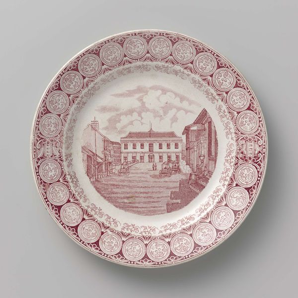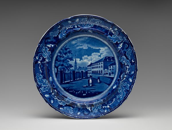 This ten-inch diameter plate was created by Joseph Stubbs around 1819-1836. Notice the striking blue and white contrast, achieved through transfer printing on earthenware. The central image, framed by a floral border, draws us into a scene of architectural grandeur. The building's classical facade, complete with imposing columns, dominates the plate's composition. Stubbs employs a detailed, almost topographic approach. The rigid lines and symmetry of the architecture is softened by the delicate, organic motifs of the surrounding floral patterns. This juxtaposition creates a visual dialogue between the rational and the natural. The monochrome palette reduces the scene to its essential forms and textures. The choice of a singular color scheme highlights the graphic qualities of the print, turning the utilitarian object into a study of form and representation. Through this interplay of pattern, image, and form, Stubbs invites us to consider the relationship between representation and function, subtly questioning the values we project onto everyday objects.